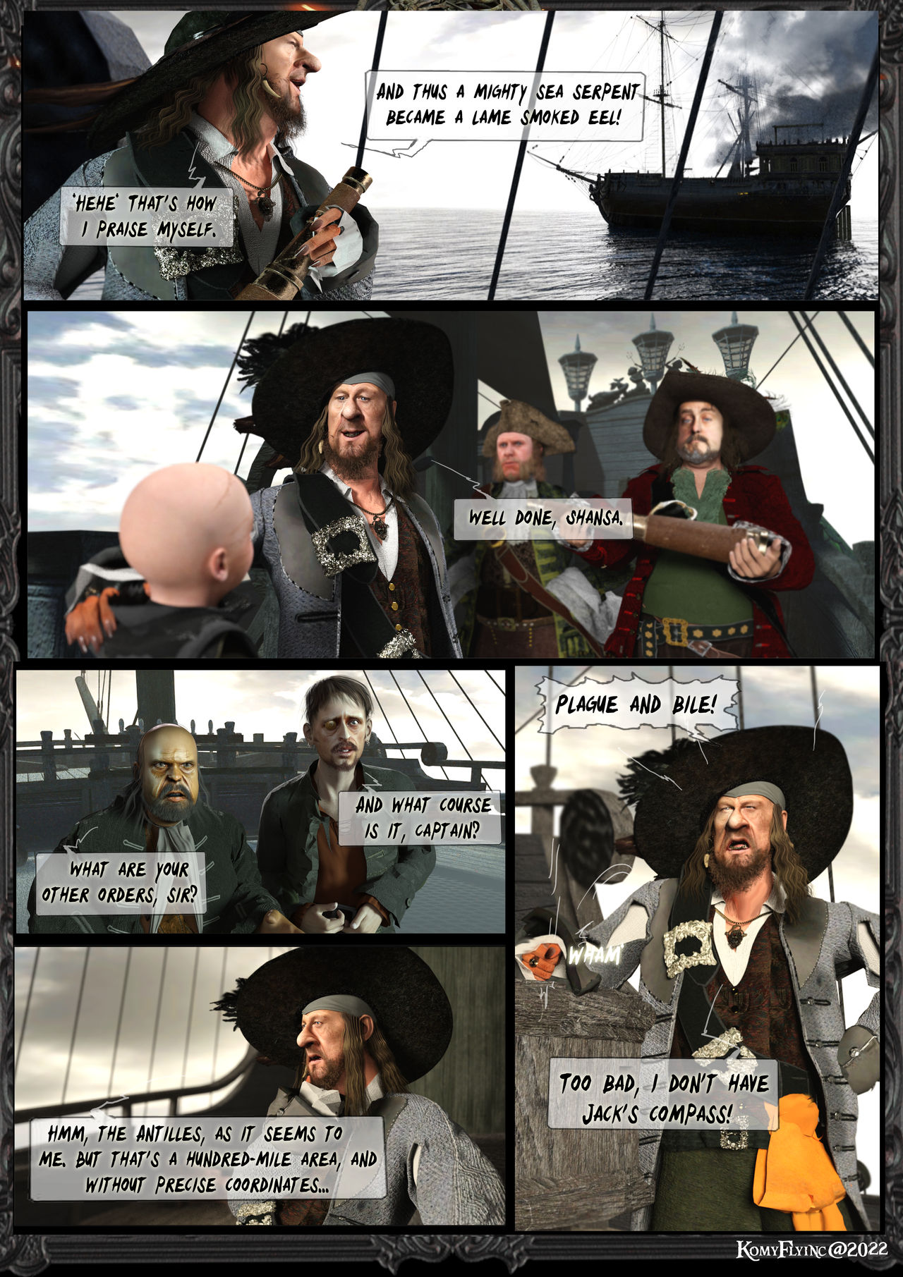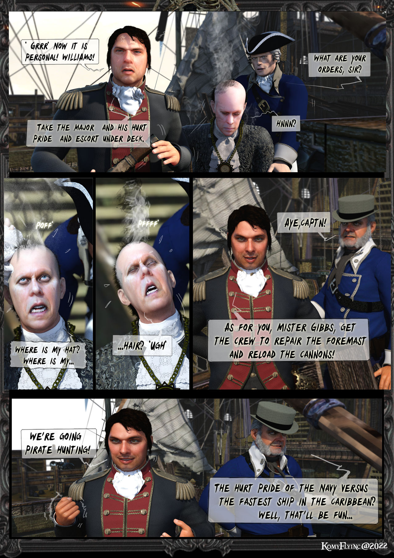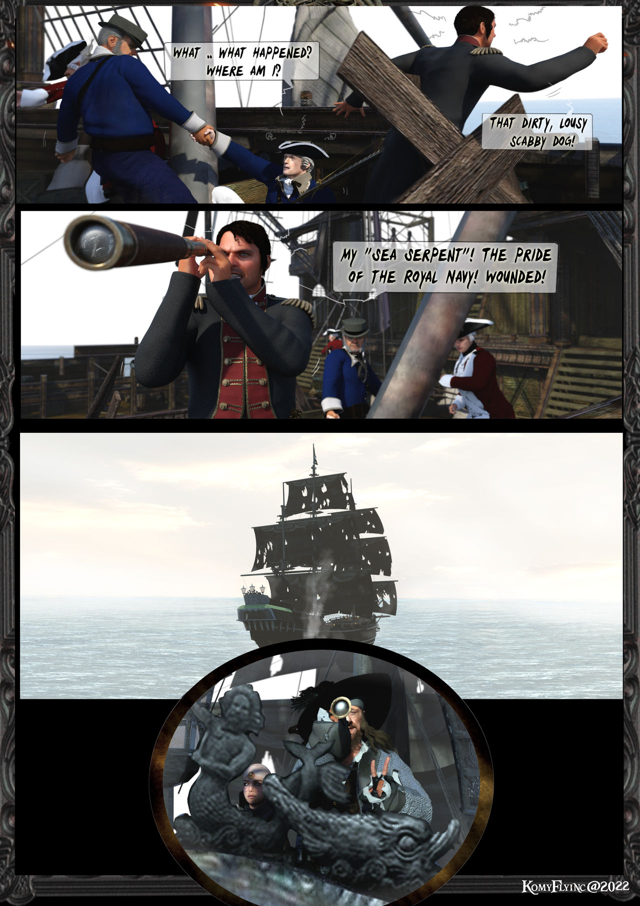Was leider Captain William Benbow zu spüren bekommt.Neben ihm am Steuerrad steht Mr Gibbs und hört geflissentlich zu.