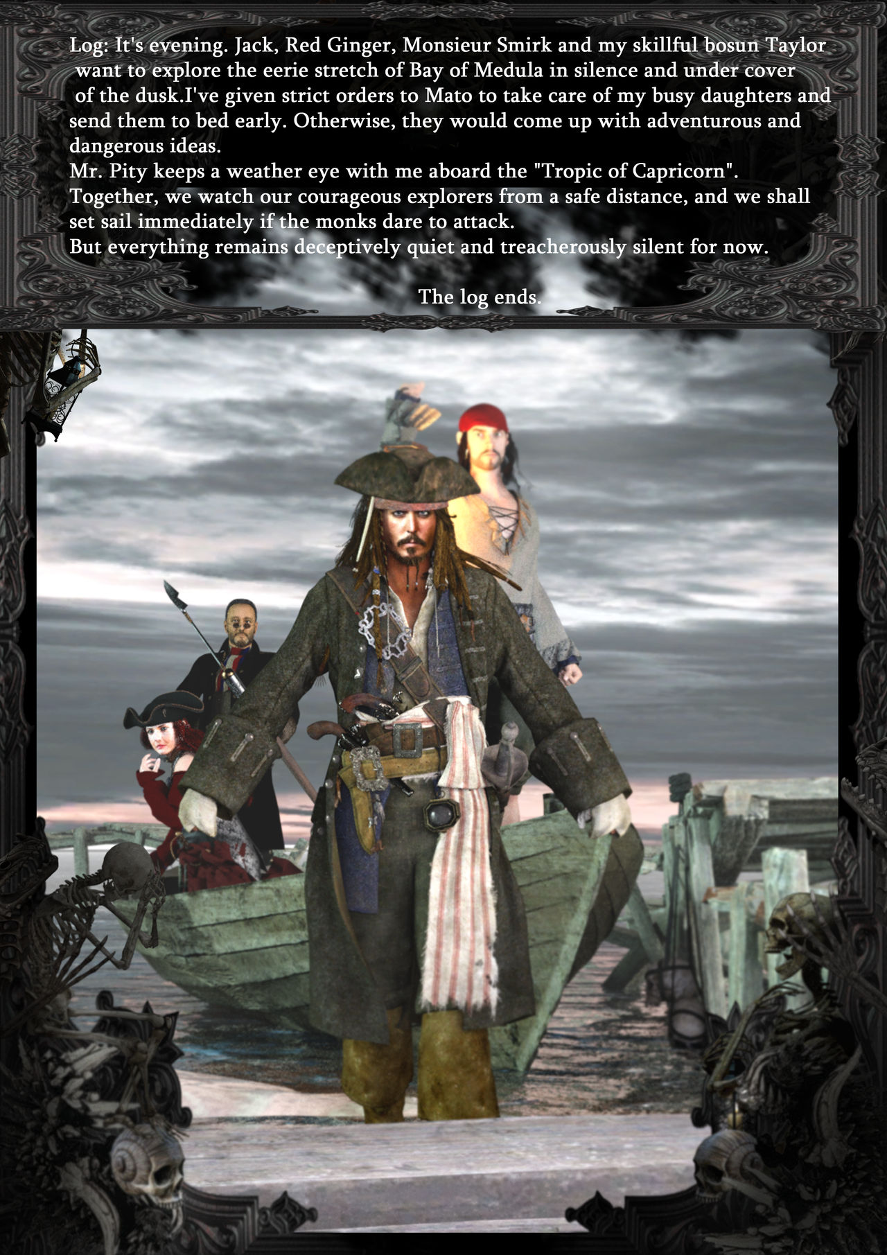 Logbuch: Es ist Abend geworden und Jack will zusammen mit Red Ginger ,Mon Signeur Smirk und meinen tüchtigen Bootsmann Taylor den unheimlichen Küstenabschnitt der Bay de Medula zu erkunden in der Stille der Dämmerung und Schutz.