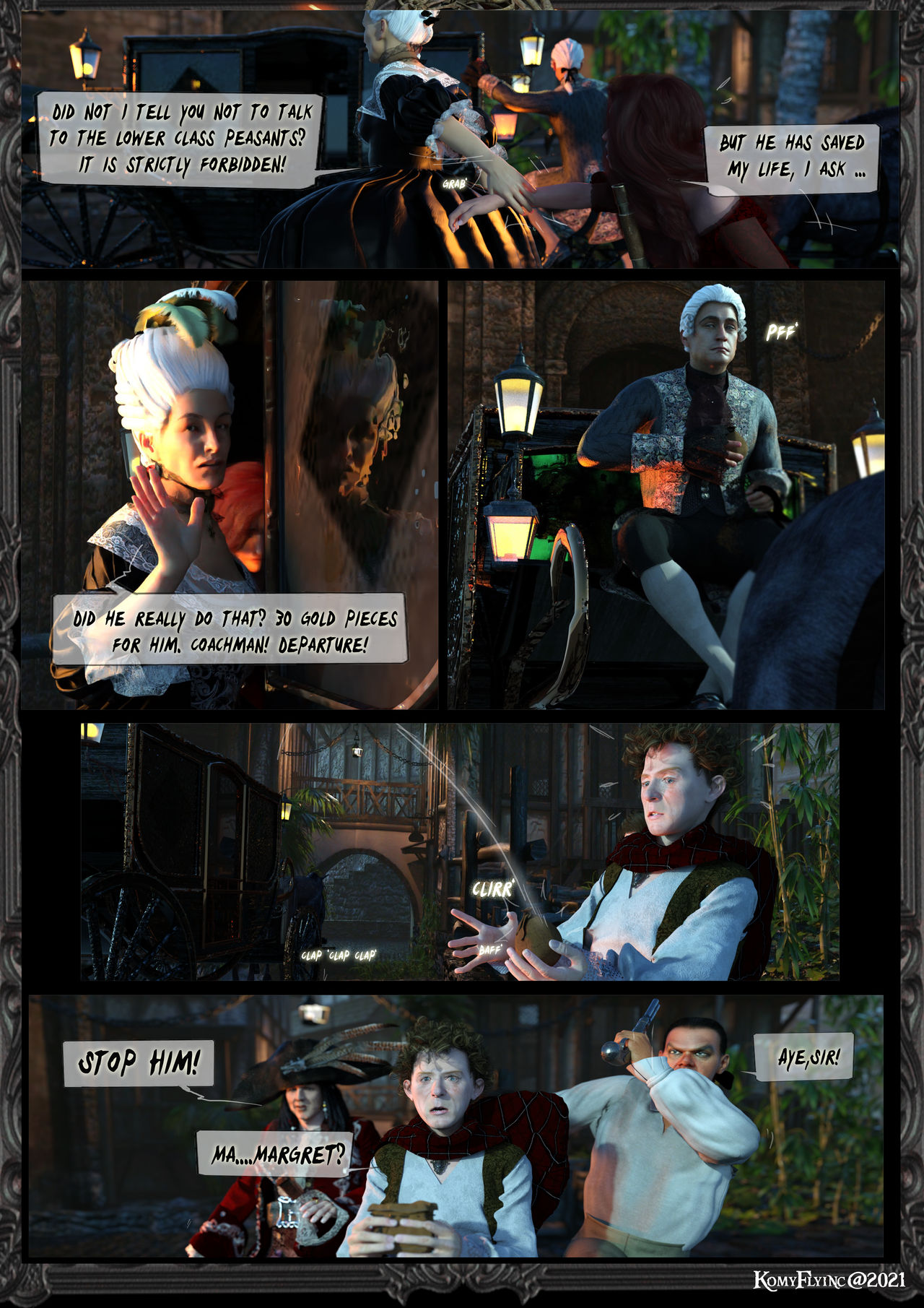 Der da immer noch nicht ganz begreifend dasteht.Gouvernante: So? Tat er das? 30 Goldstücke für ihn. Kutscher! Abfahrt!