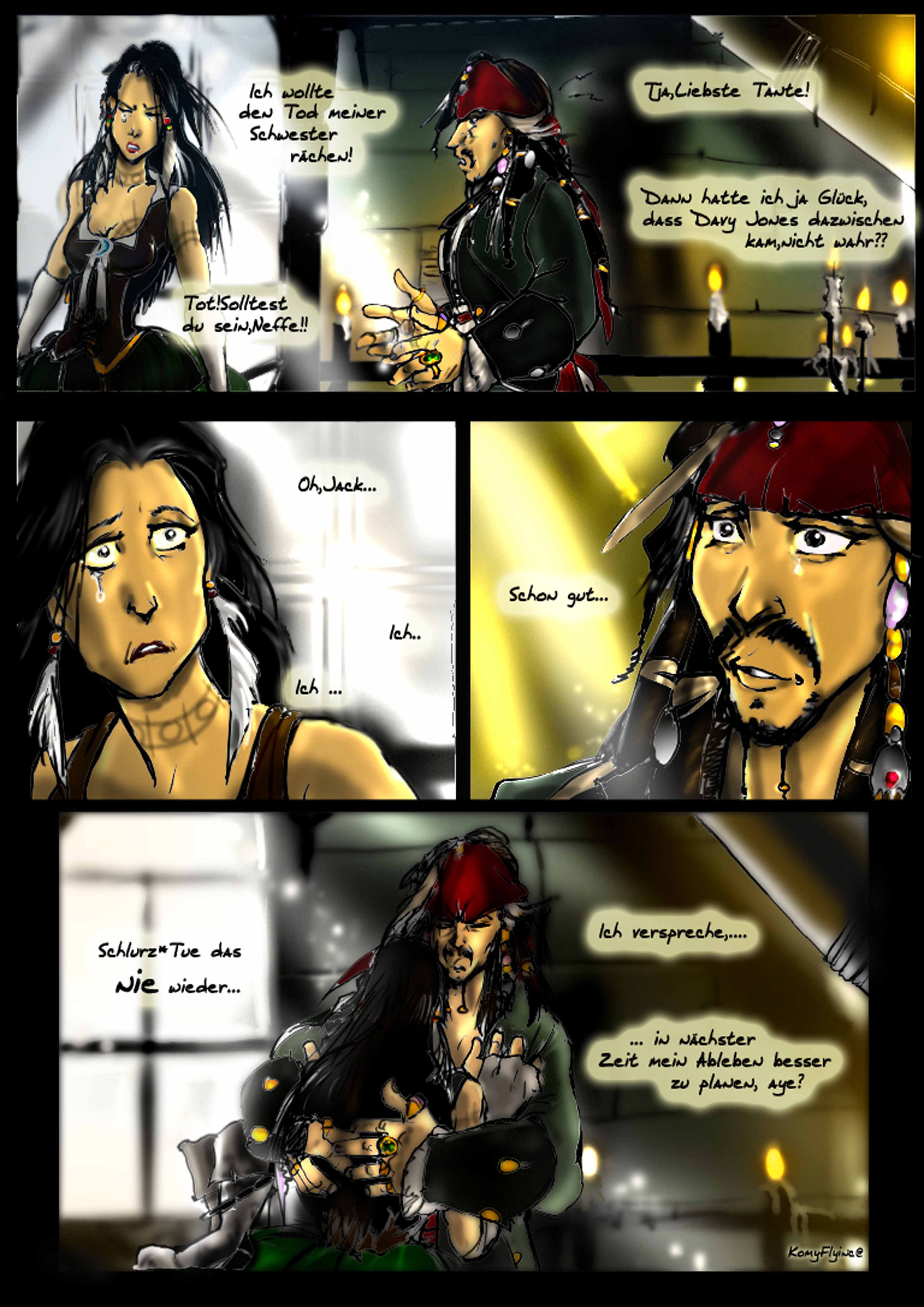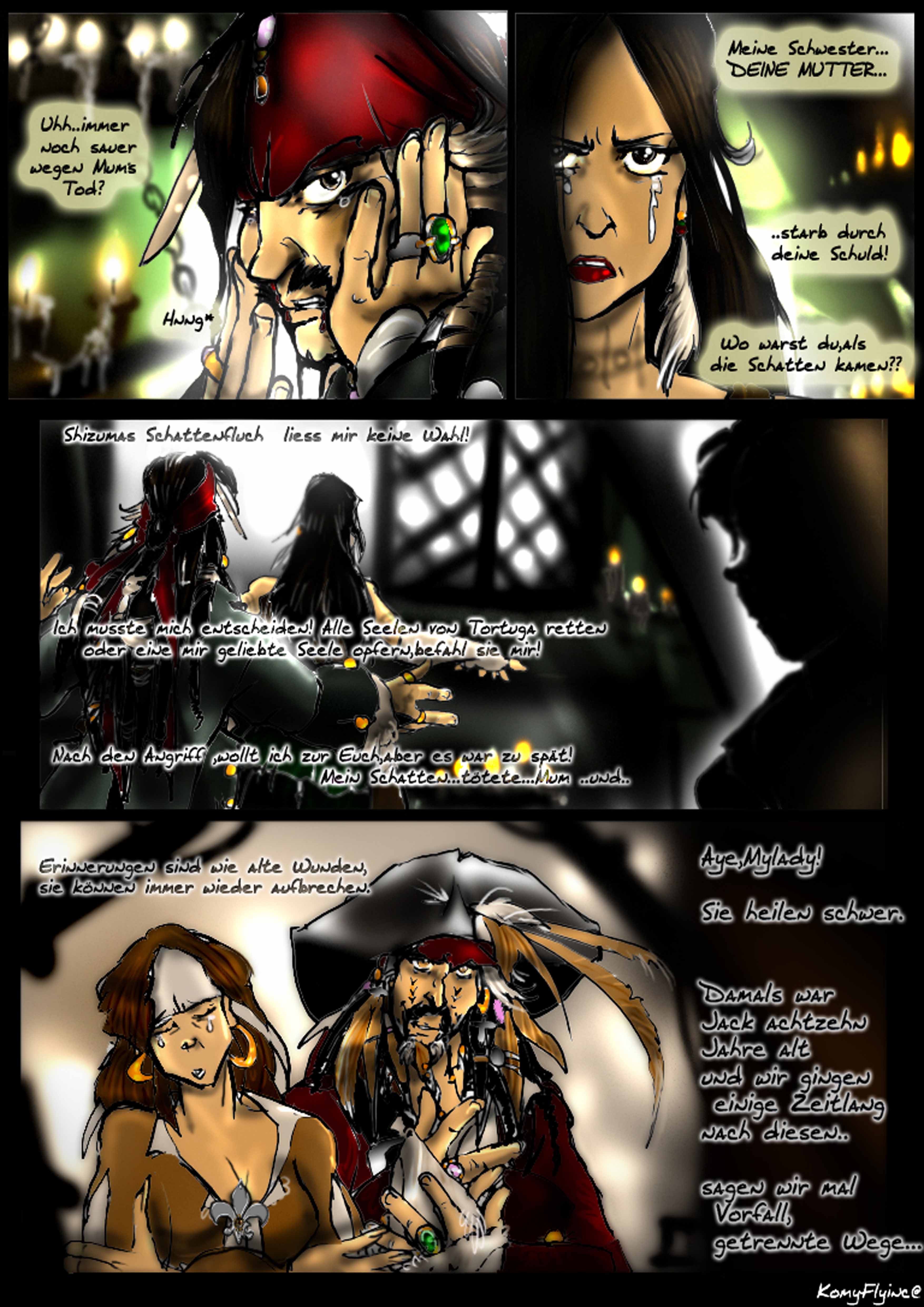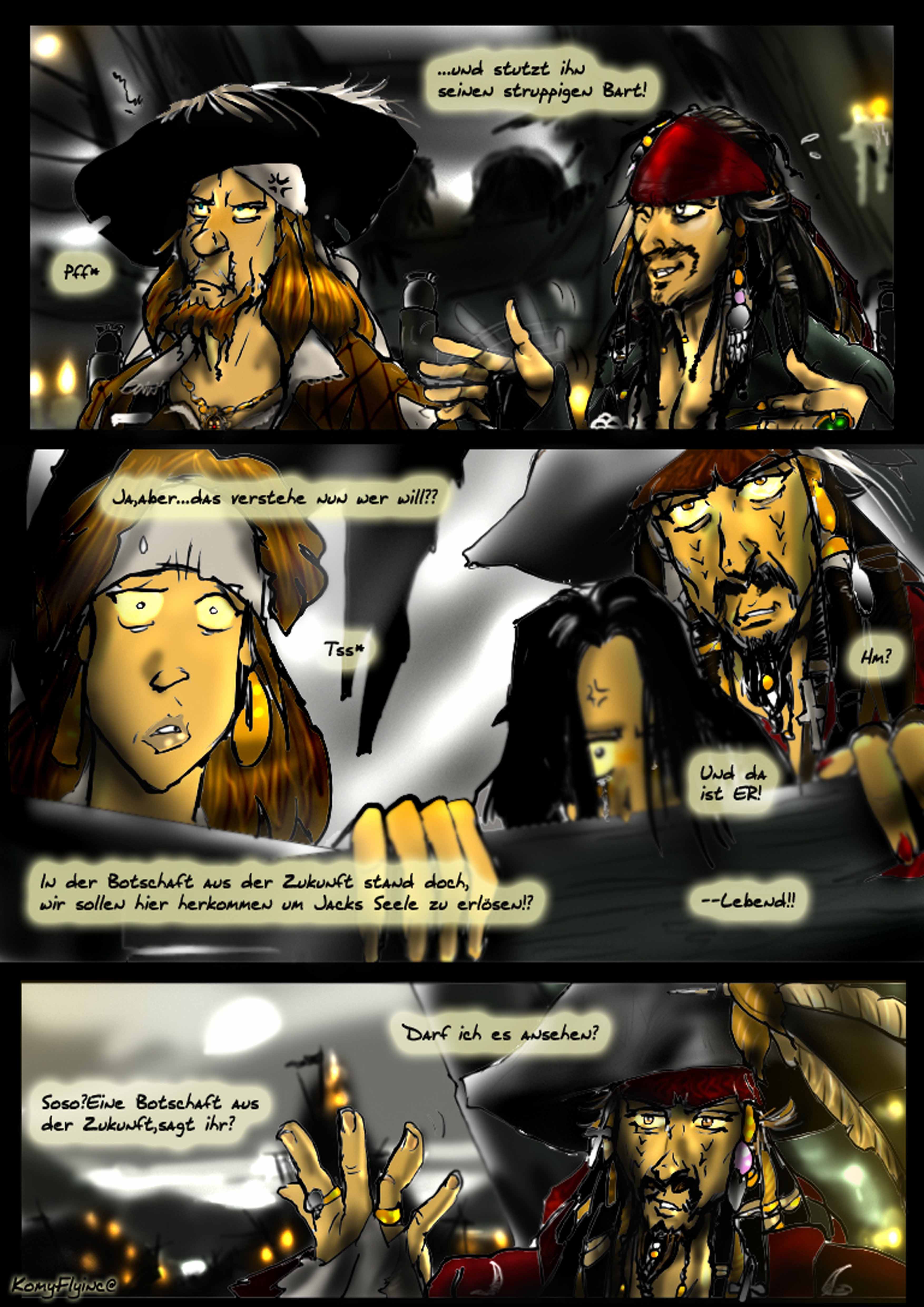 und das sein erstes Kommando nicht gutausging. Cutler Beckett Vater ,später von ihm selber gejagt wegen der Meuterei und Befreiung der Sklaven(Den Verlorenen aus Sümpfen,die bei Jacks Tod ihm das letzte Geleit sangen)Das P eingebrannt auf seinen Arm, die Andeutungen von Cutler Beckett und selbst Davvy Jones Zitate sollte man ansehen nochmal und gut kombinieren^^alles versteckte Hinweise in den Filmen.