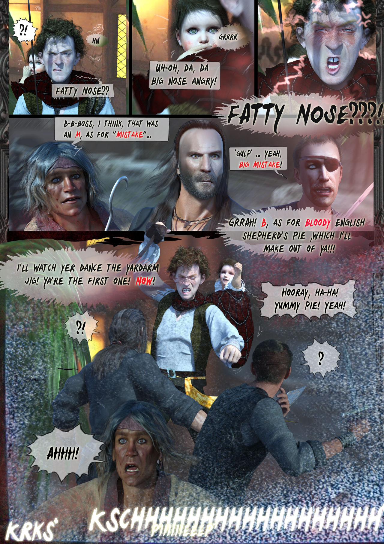 Von oben natürlich kräht jubelnd die Sprotte alles nach ,was immer noch Hector den fliehenden Räuber hinterher brüllt.