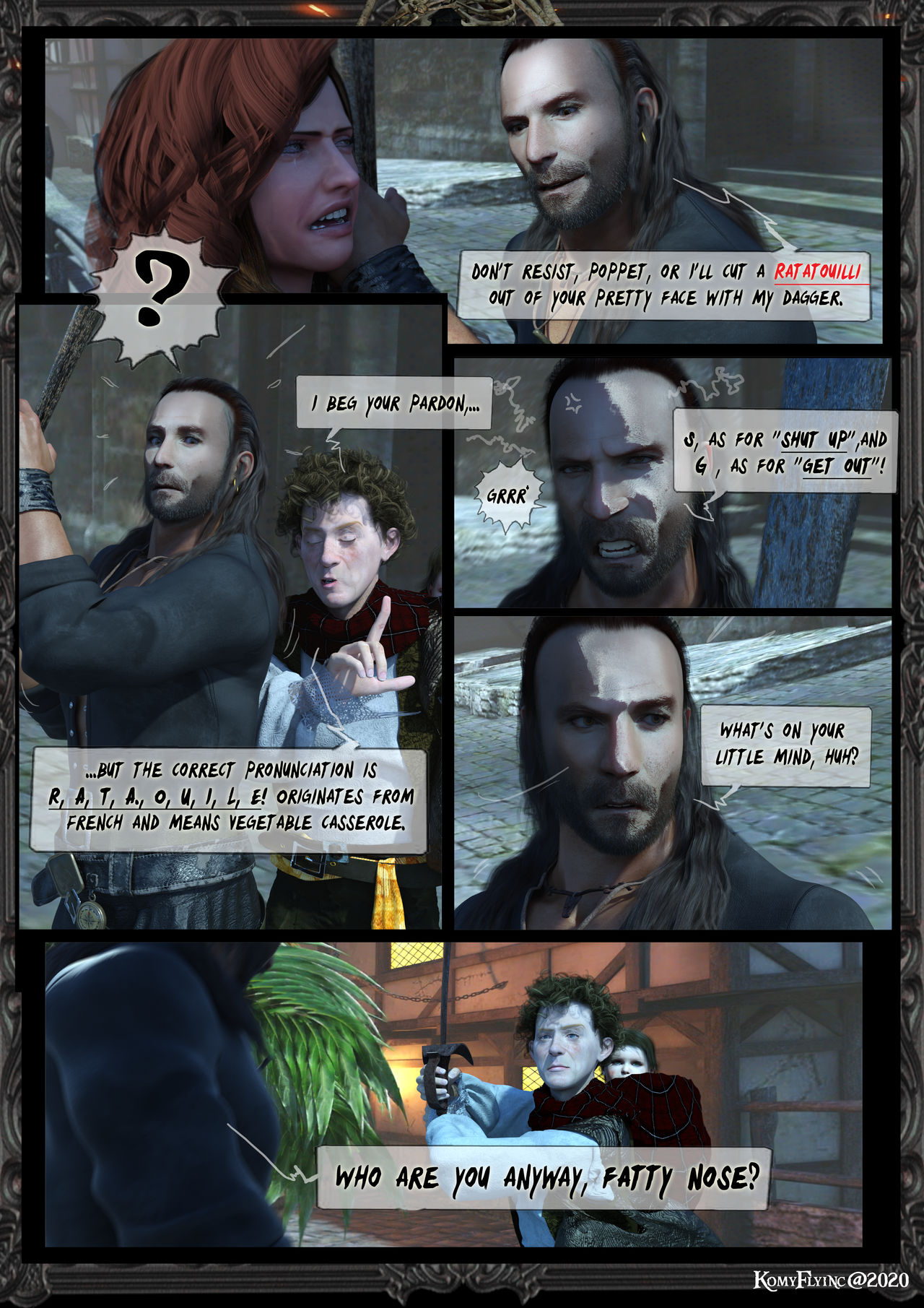 Hauptmann: Schätzchen,wehre dich nicht oder ich werde Ratatulli aus dein hübsches Gesichtchen zaubern mit meinen Dolch.