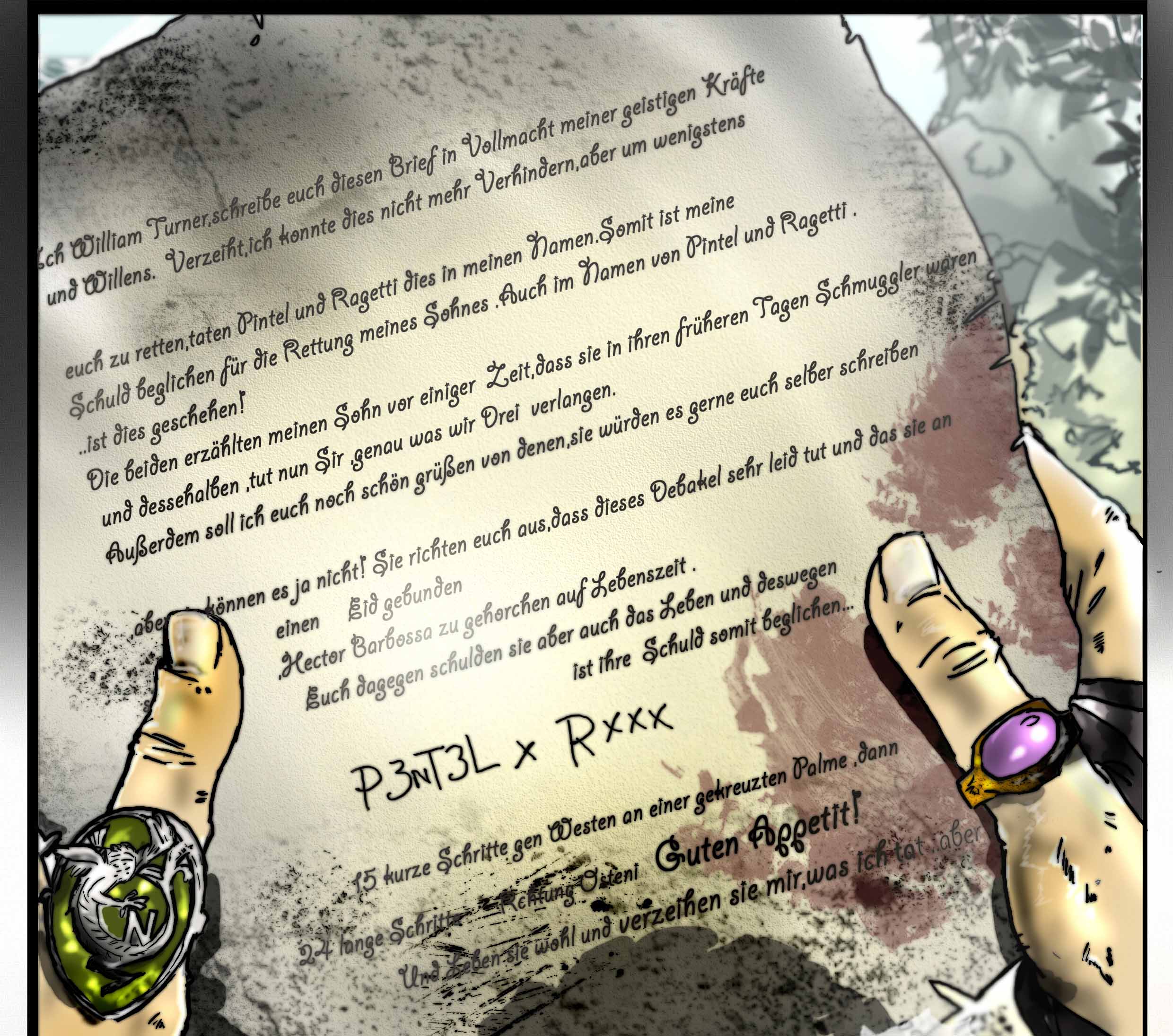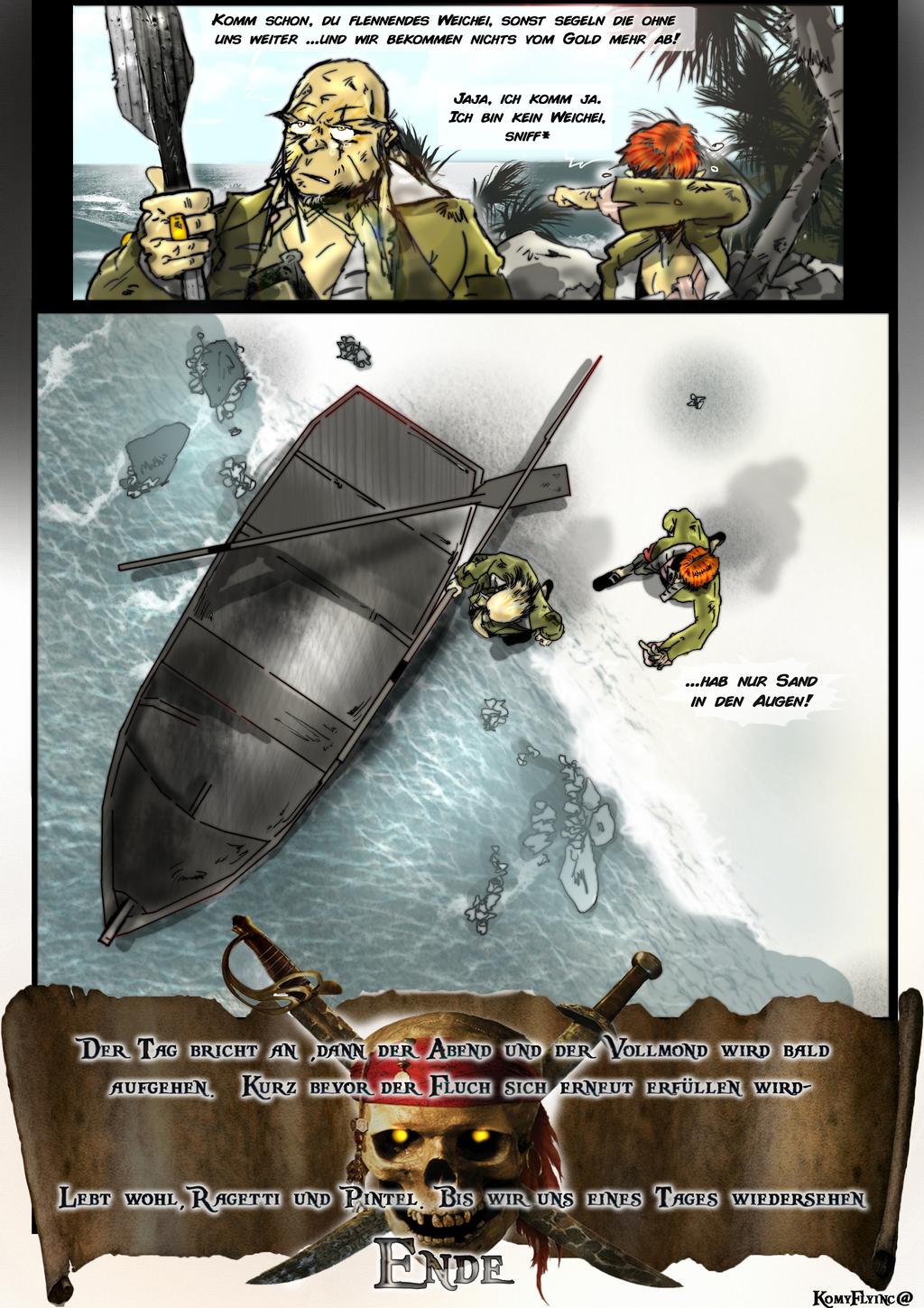 Jack erwacht ziemlich verdrießlich auf der Schildkröten (oder Schmugglerinsel) und ist ziemlich in Rage wegen der Meuterei .Da findet er neben sich den Brief von Pintel und Ragetti mitsamt Säbel und Klamotten .In den erklären sie dann folgendes: