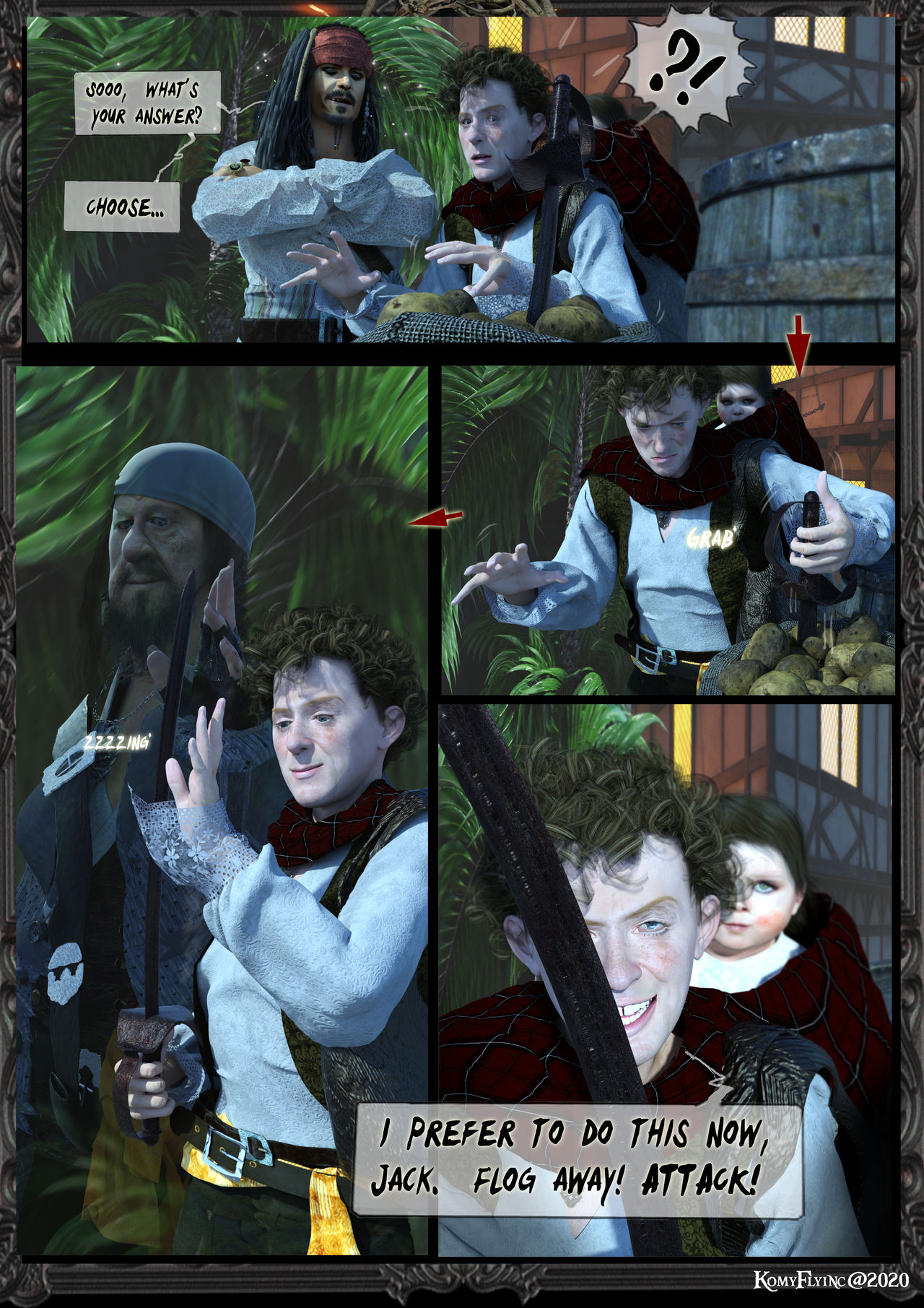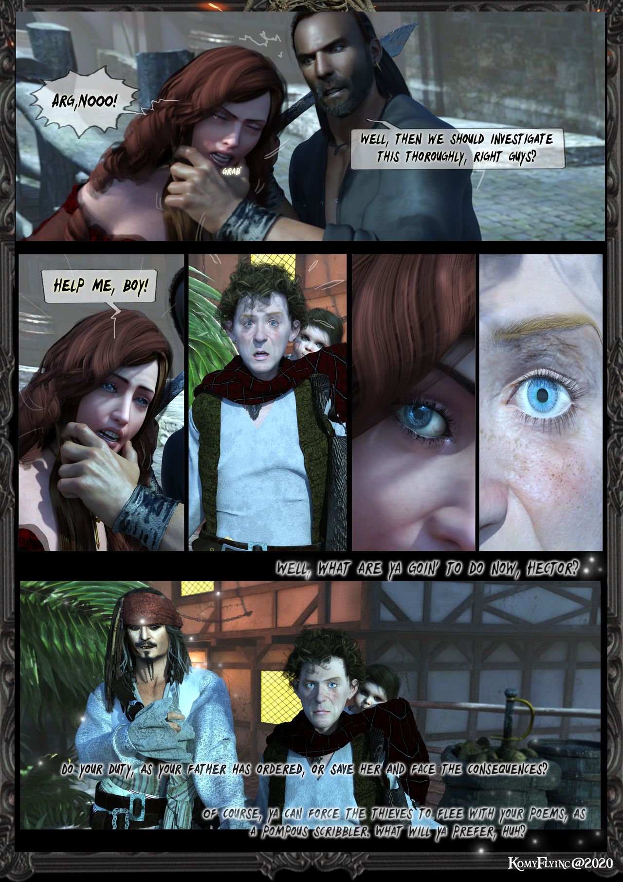 Jack sieht das feizend und tänzelt herum um Hectors Gesicht und stellt ihn vor einer wichtigen Frage.Jack:Tja,was nun,Hector? Deine Pflicht erfüllen wie es dein Vater auftrug? Oder sie retten und die Konsequenzen tragen? Du kannst natürlich auch die Diebe mit deinen Gedichten in die Flucht schlagen als pomadiger Schreiberling-wie entscheidest du dich jetzt,hm?