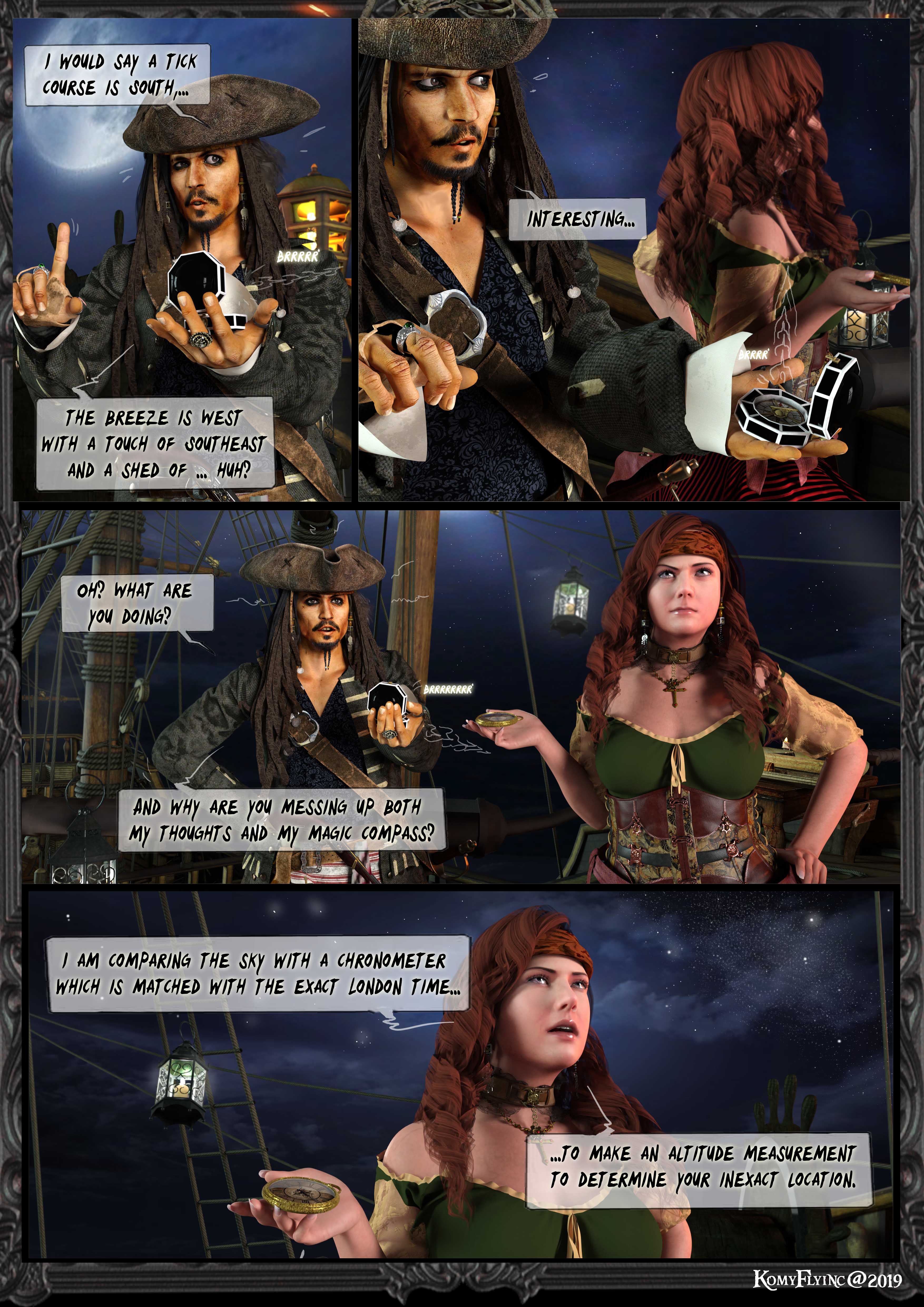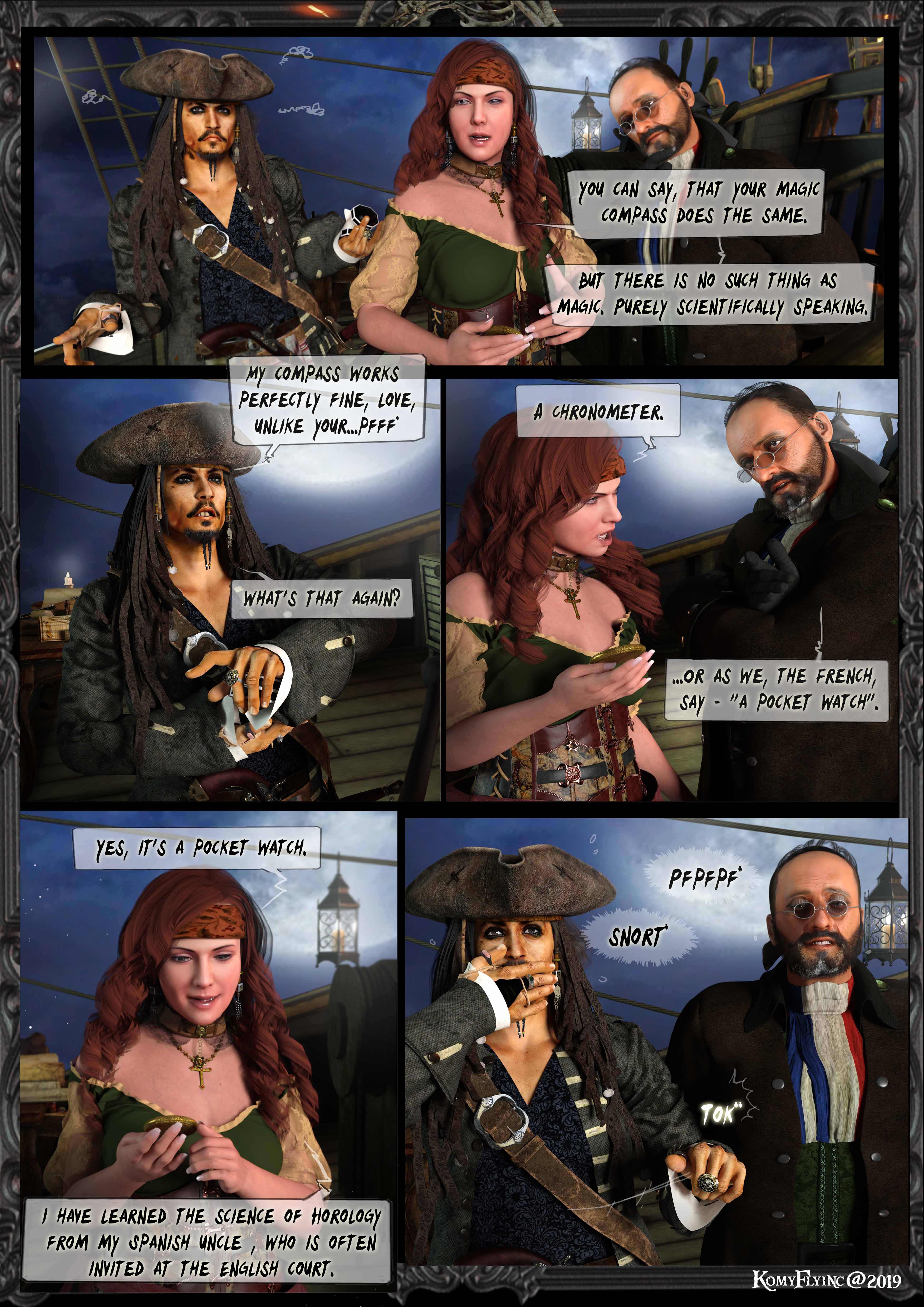 Jack: Ich würde sagen ,ein Tick Kurs Süd ,eine Brise westlich mit einen Hauch Südost,...hm?