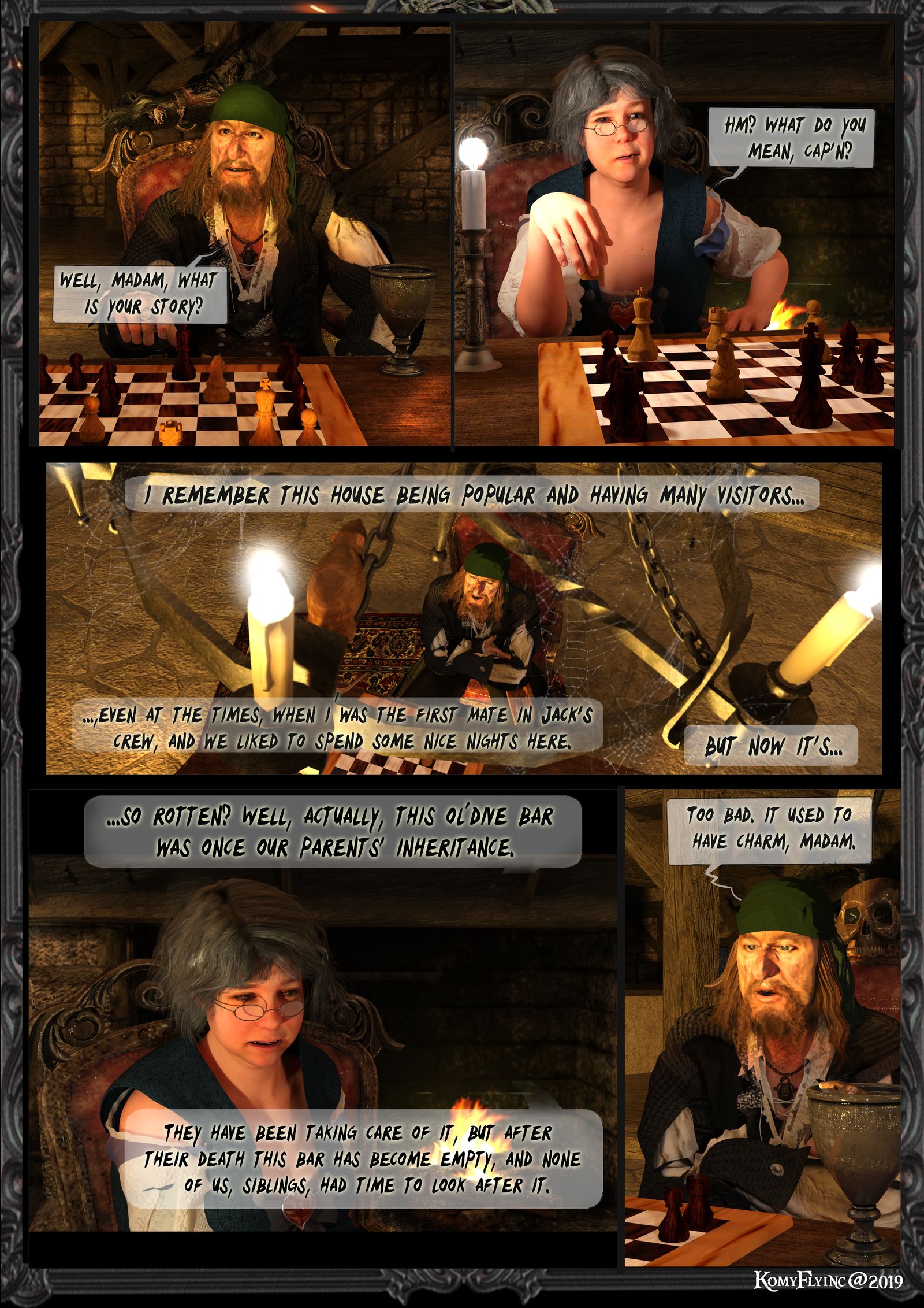 Komy:Sorgt euch nicht zu sehr,Captn. Ich habe ab morgen einen Verkaufshandel mit einer gewissen Lady Devonshire-Die Witwe ist sehr reich und möchte aus diesen alten Kasten ein Waisenhaus machen . In wenigen Wochen werdet ihr dieses Gemäuer nicht mehr wieder erkennen vor Erneuerung und Glanz.