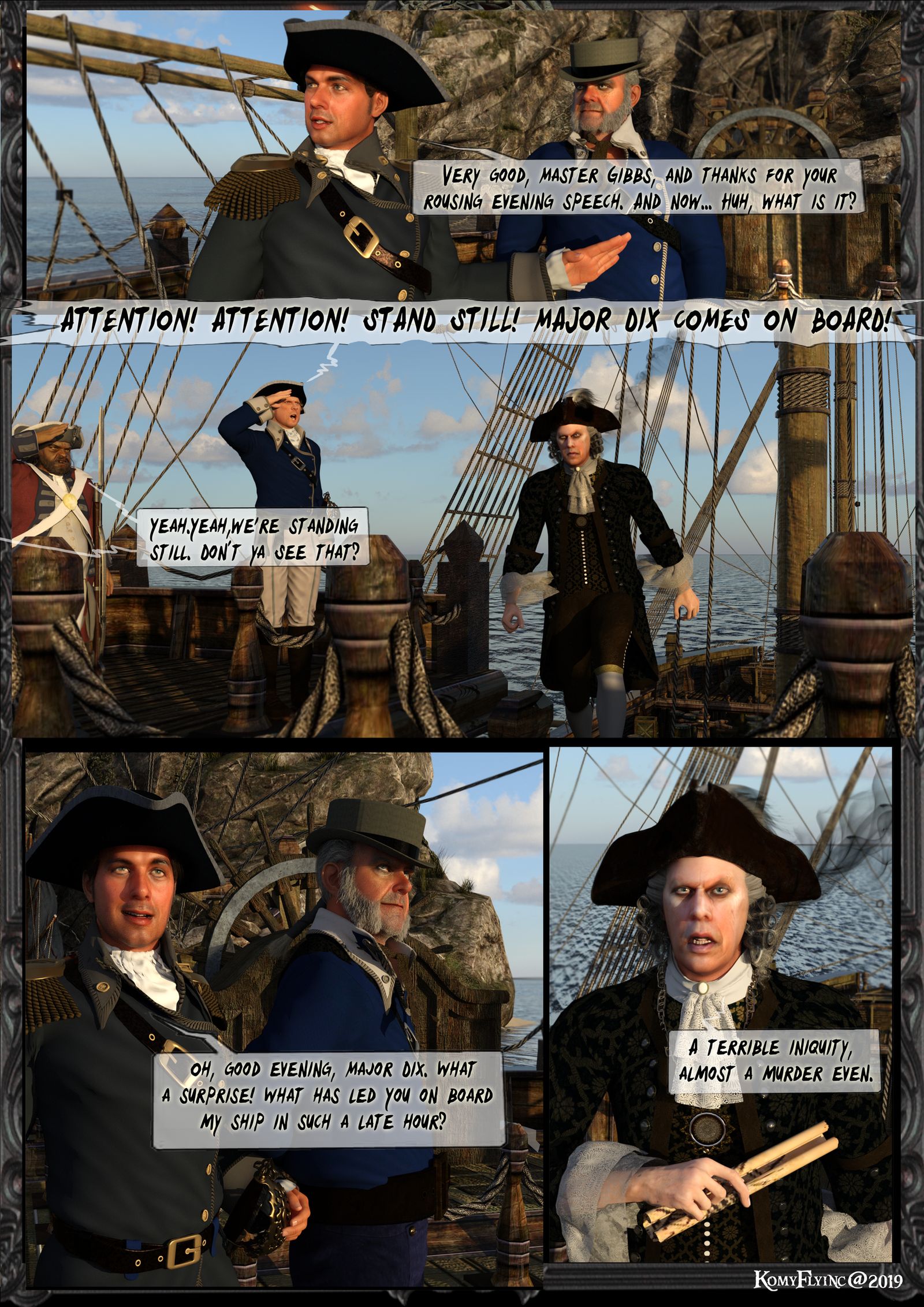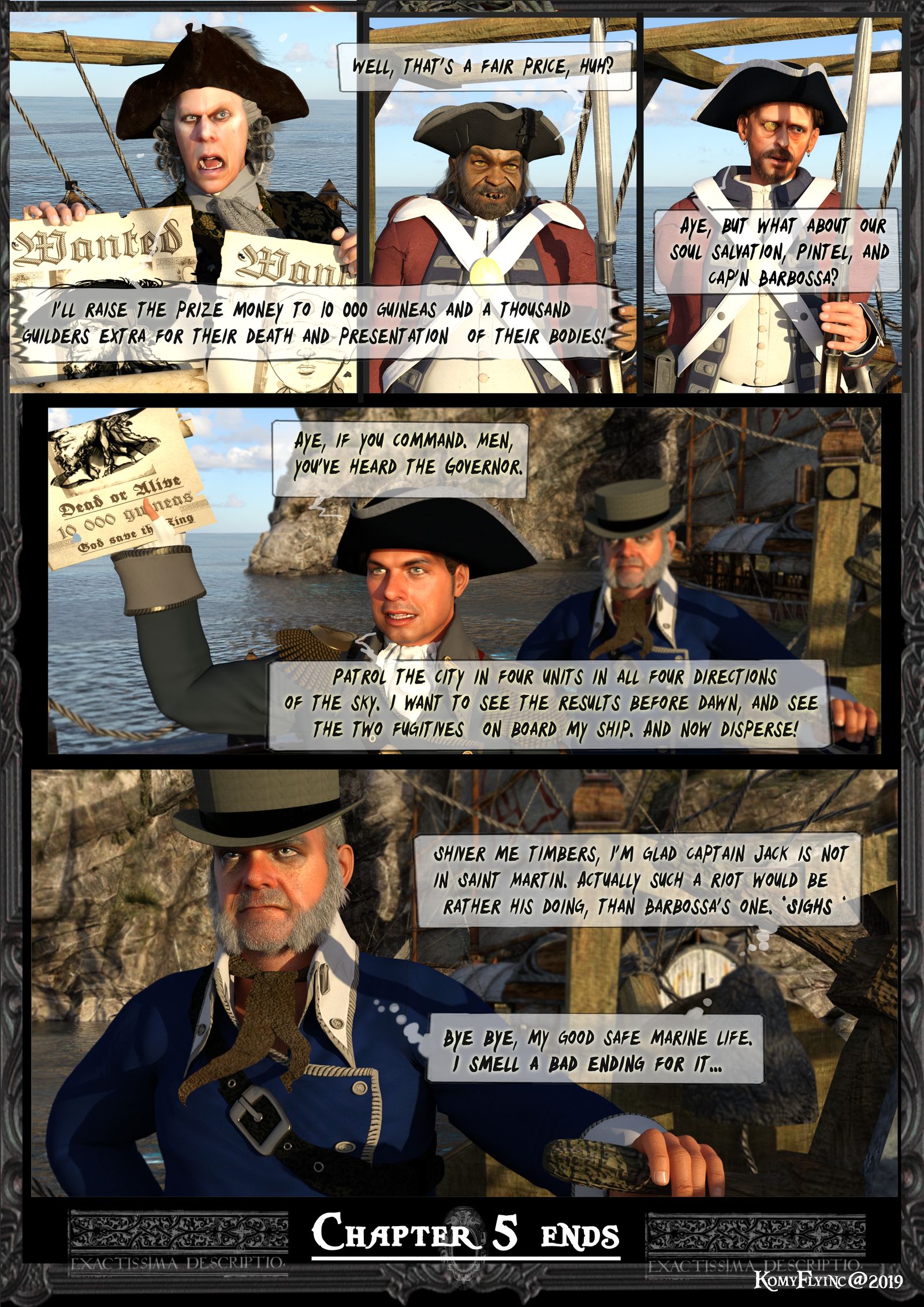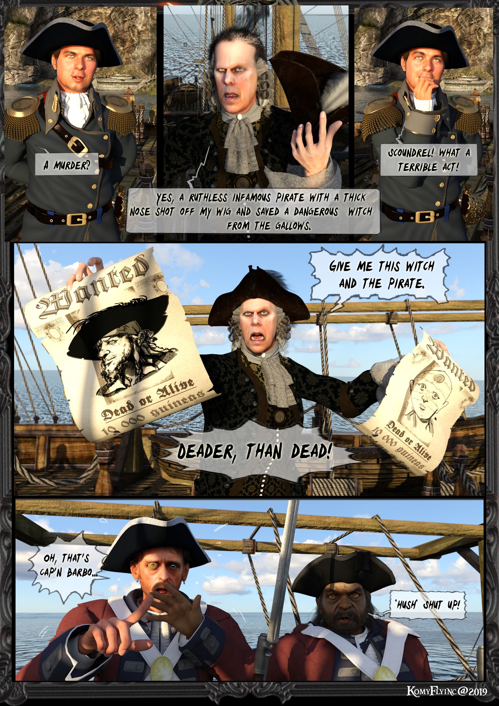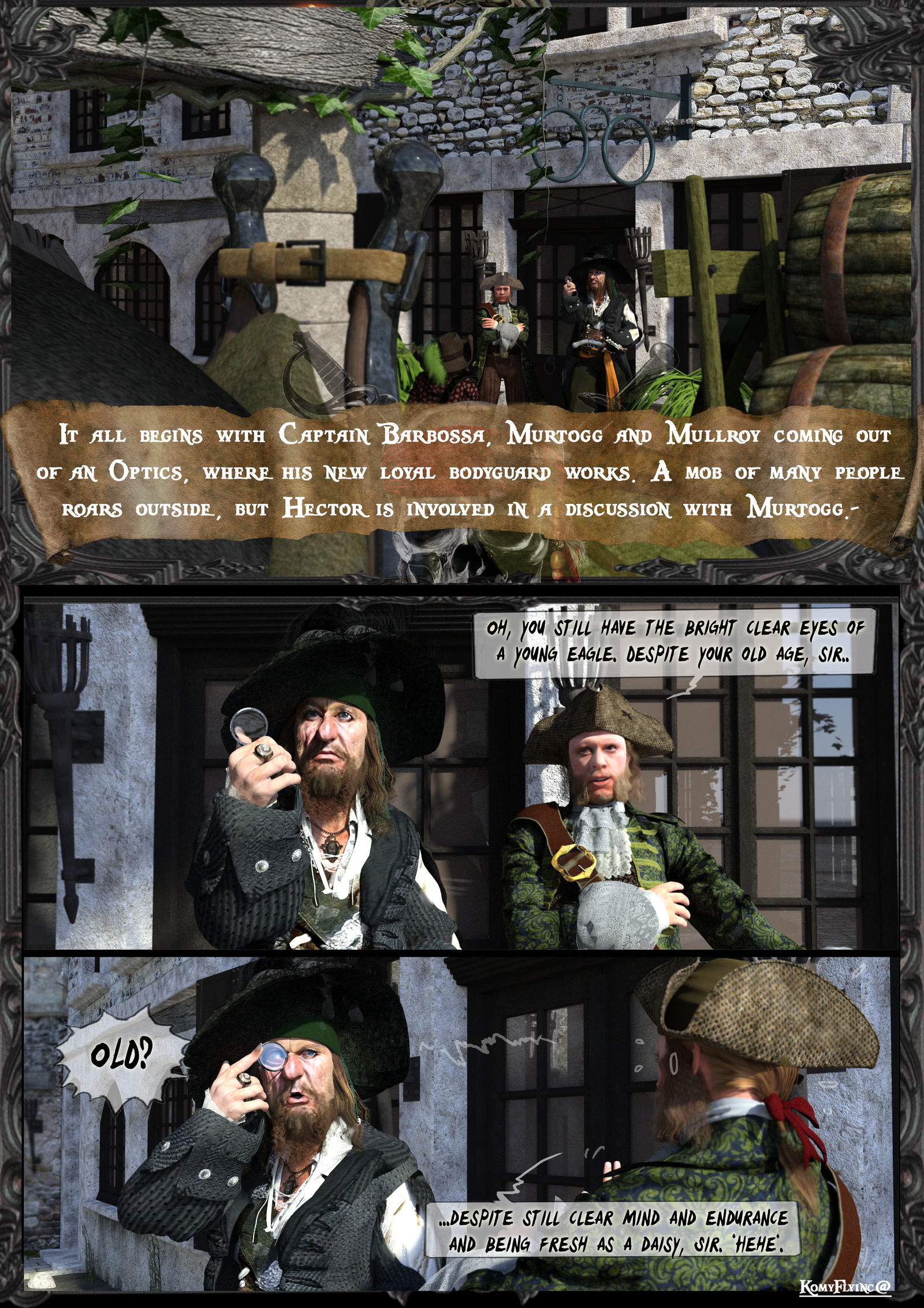 ,das Captain Barbossa, Murtogg und Mullroy , seiner neuen treuen Leibwache aus einem Optikerladen herauskamen und vor der Tür ein Mob herumbrüllt aus vielen Leuten.