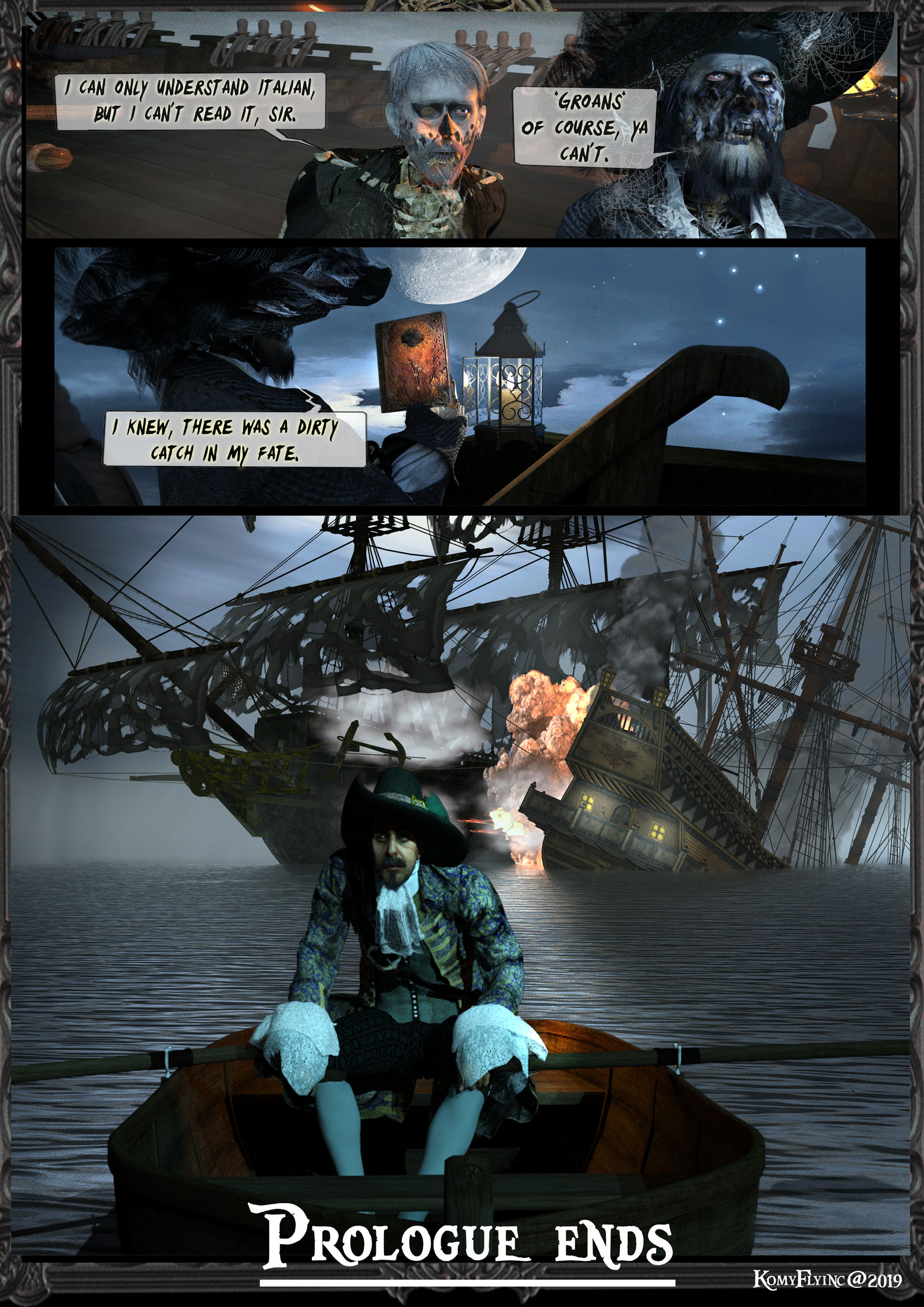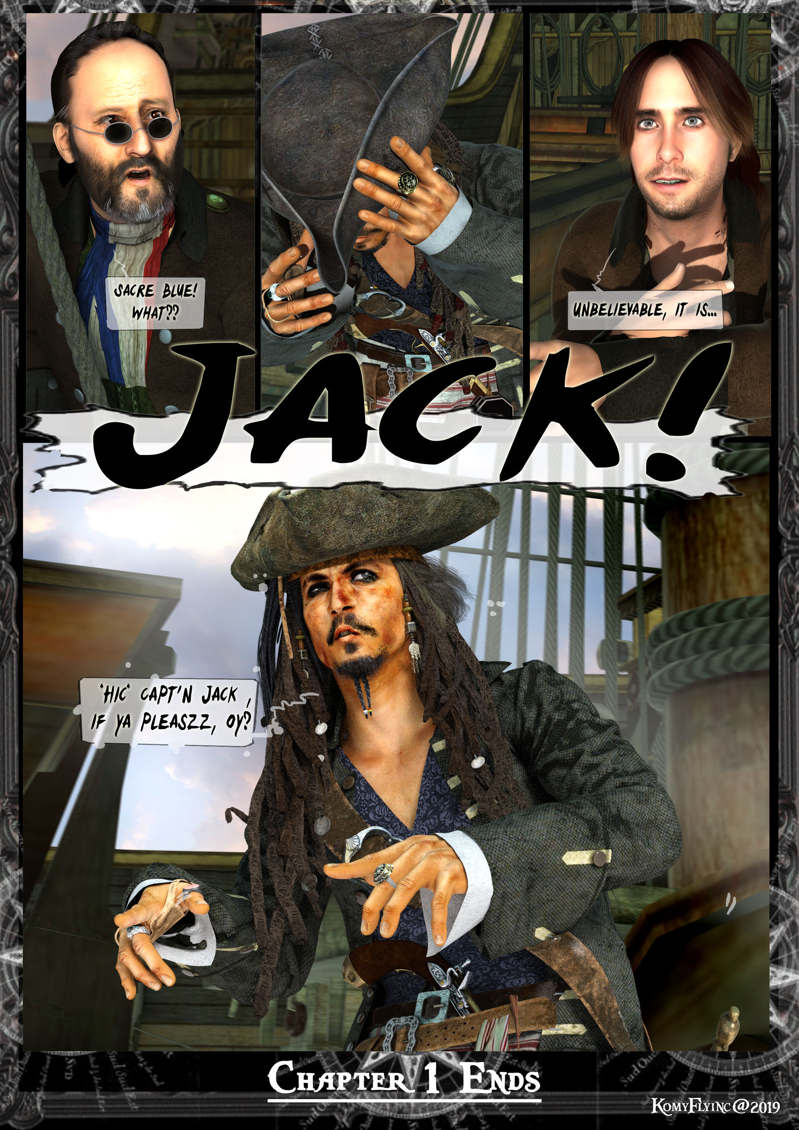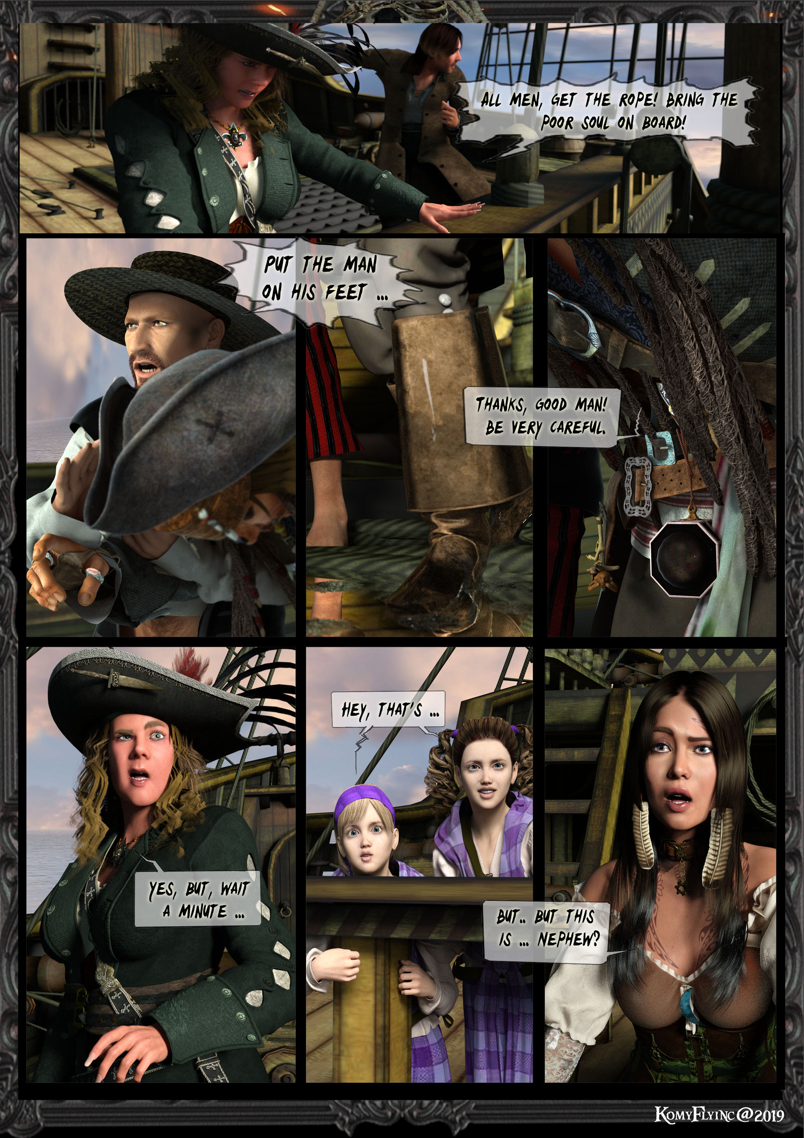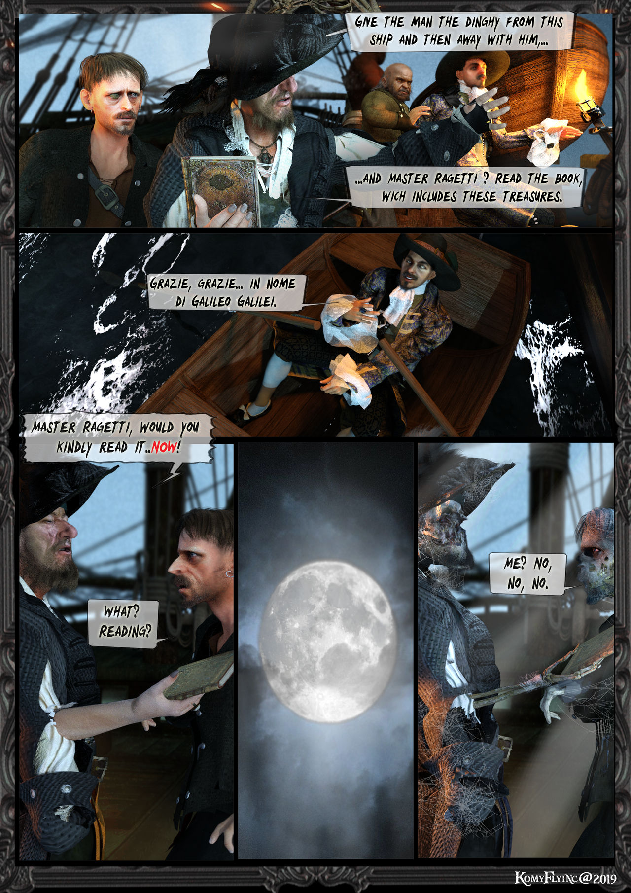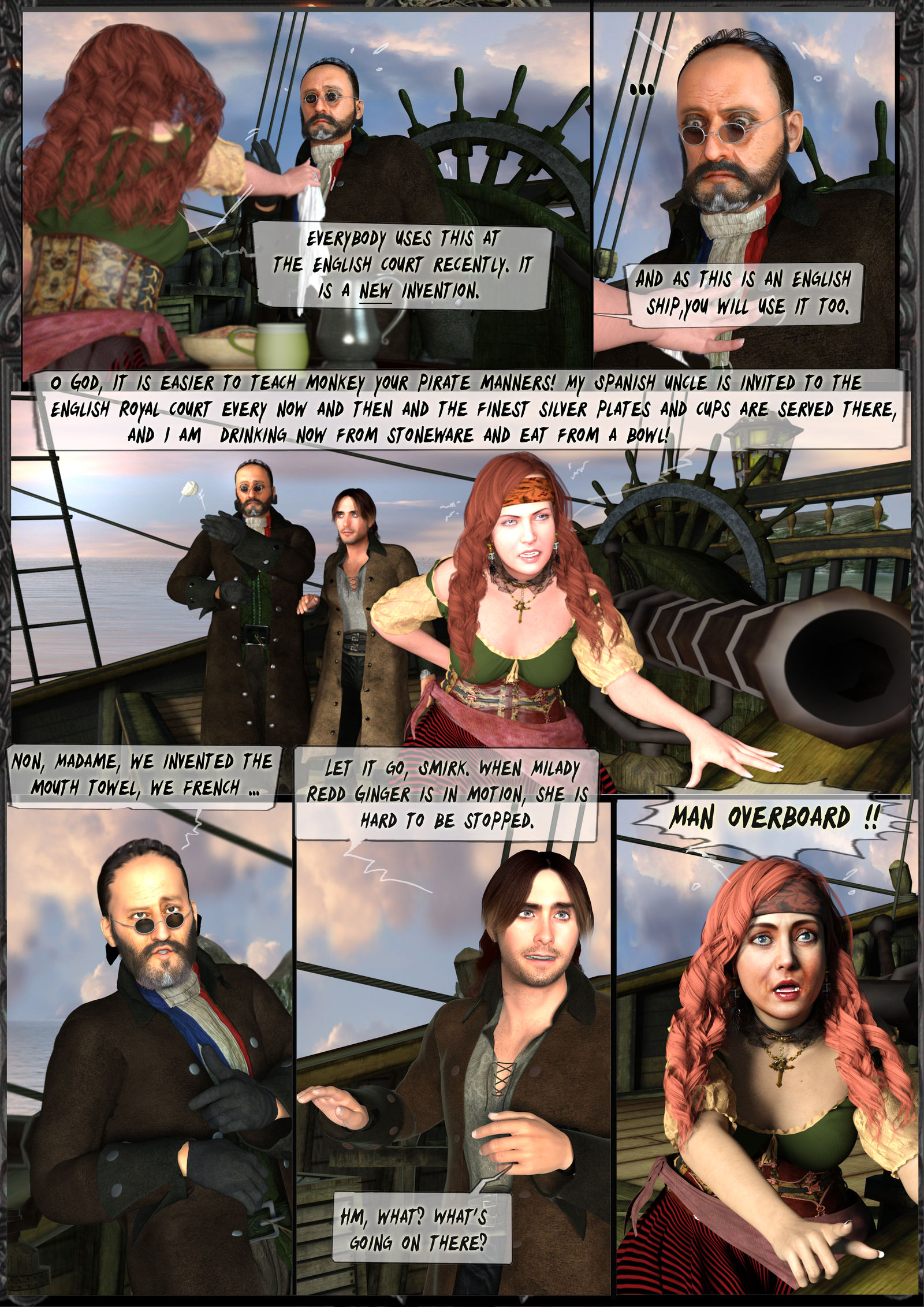 Dann blenden wir zum Steuerrad wo der aus frankreichstammende alte graue langnasige Jean Smirk steht und der blauäugige schöne Jarod ,genannt Pretty Pity,die nun einen neuen Navigator als Ersatz von Grace nun haben.