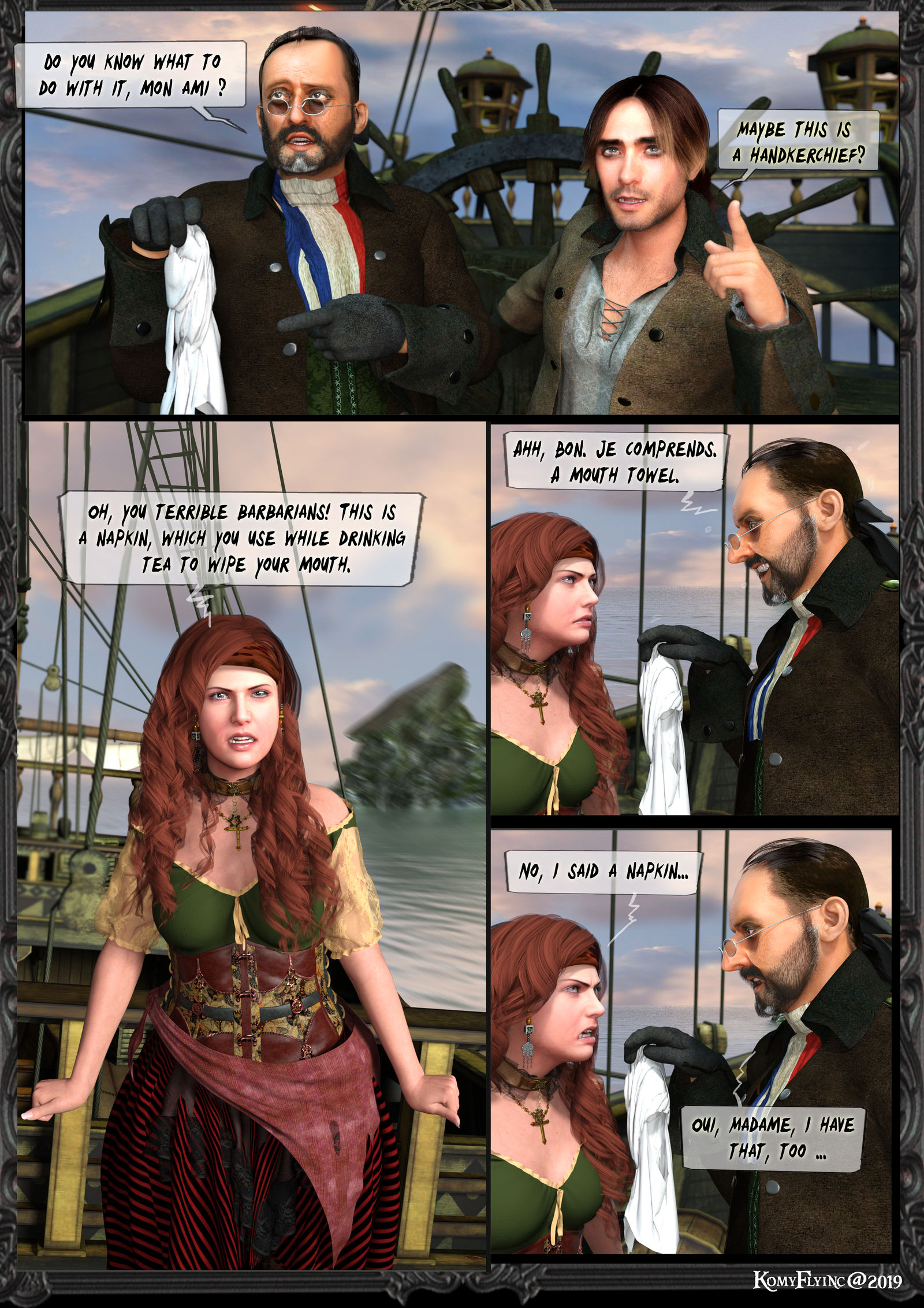 erklärt ihnen wie man eine Serviette benutzt und andere Höflichkeitsettiketten in Schnelldurchlauf,da sie schließlich aus guten adeligen Hause stammt und diesen Primitivlingen an Bord etwas Benehmen beibringen will.