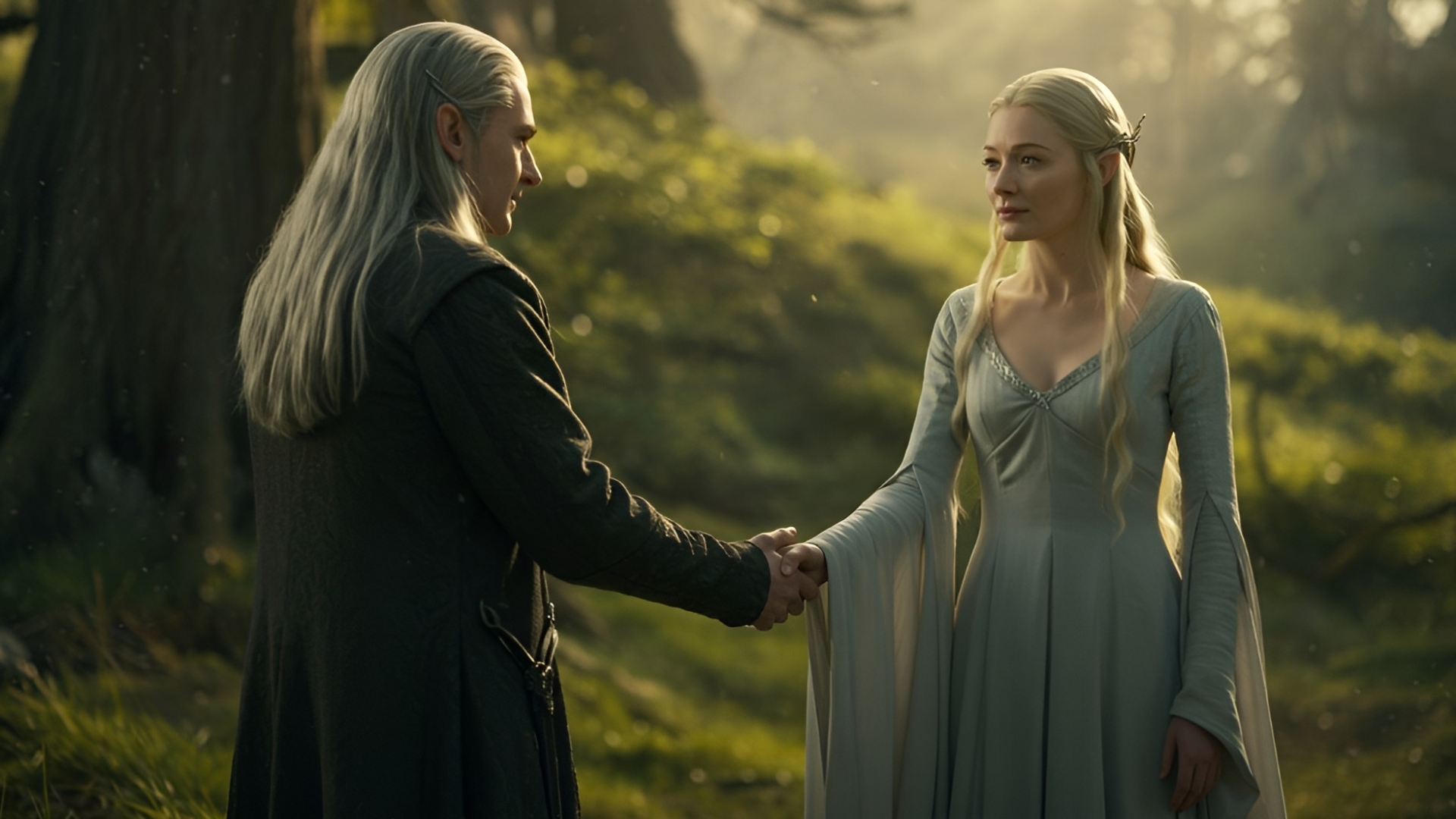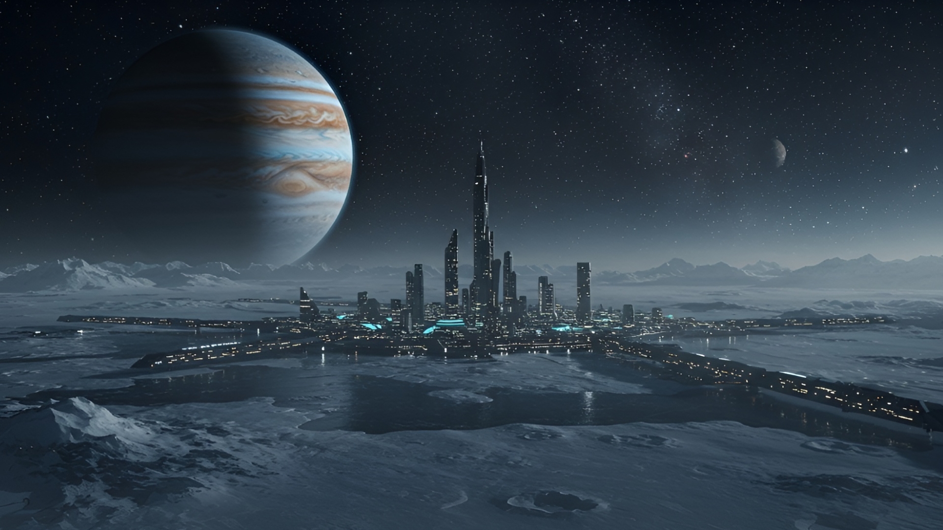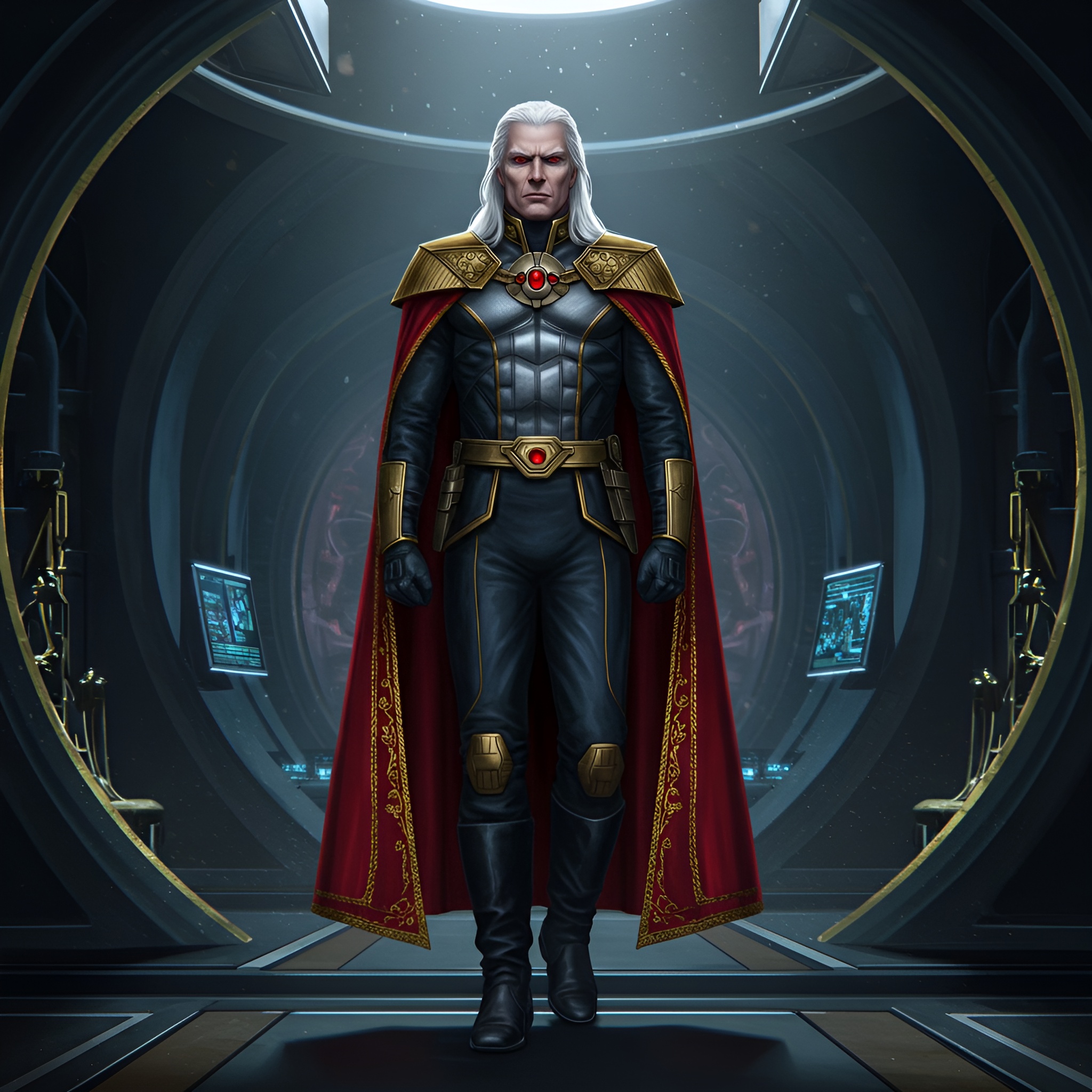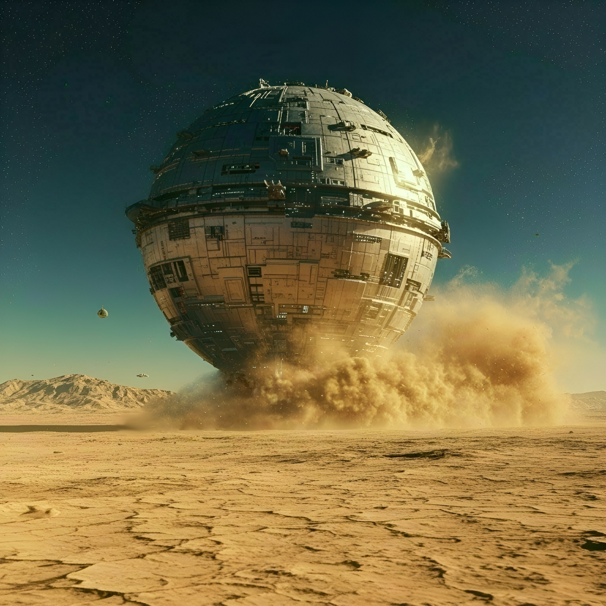 Ein typischer Kugelraumer, wie er vielleicht in einem Film aussehen würde. Darunter die Arkoniden Atlan und Thora (für die rote Augen und weißes Haar sprichwörtlich sind).