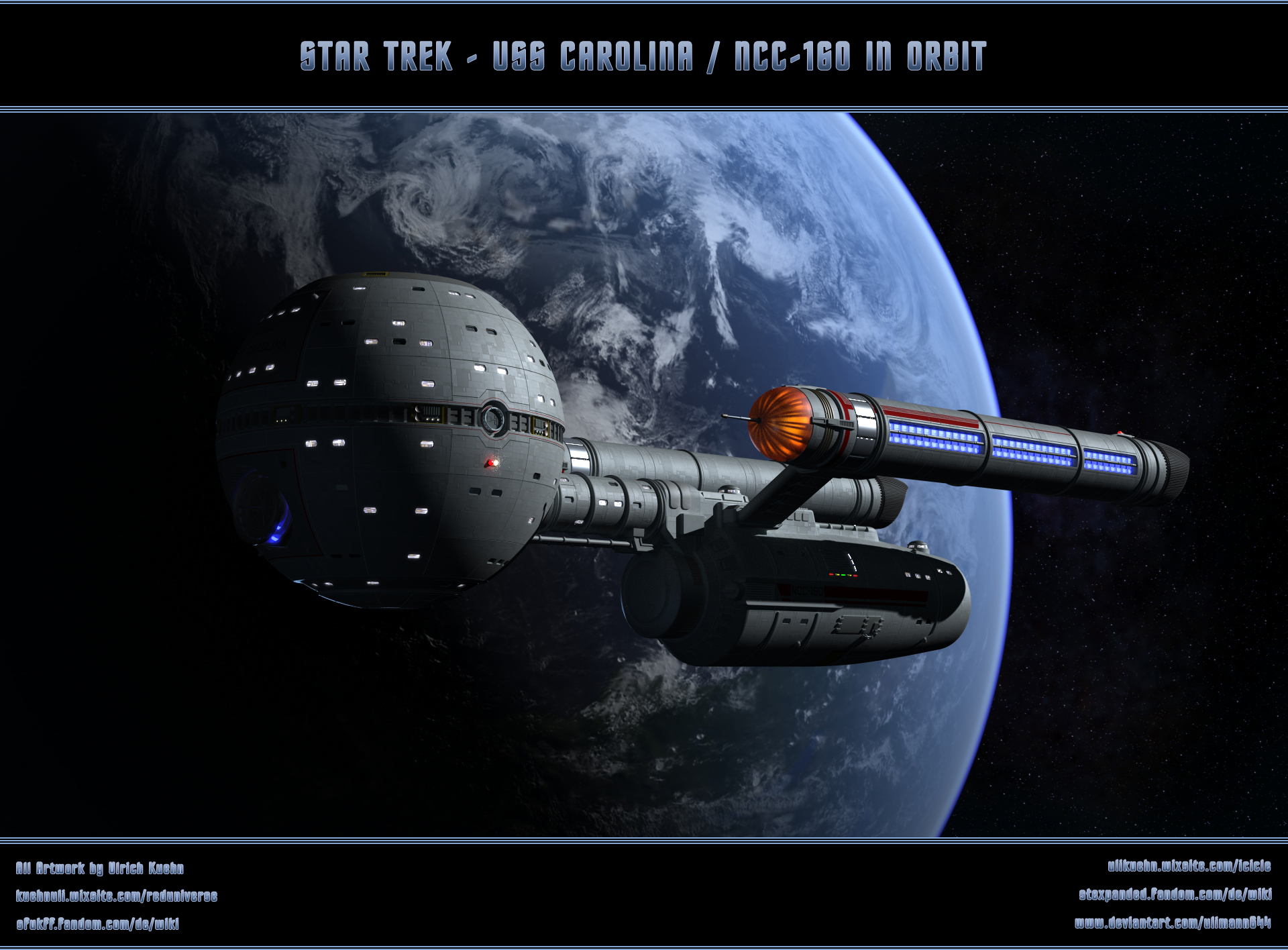 Denn immerhin habe ich 3D seit geschlagenen 10 Tagen schleifen, und nur andere Leute machen lassen. Gleichzeitig habe ich unverhältnismäßig viele KI-Bilder gepostet. Solange es dafür hier eine Nische gibt, werde ich, neben meinen 3D-Bildern, auch weiterhin KI-Bilder posten. Sollte das Thema ausgeschlossen werden ist das auch nicht tragisch - dann werde ich einfach den KI-Bereich nach DEVIANTART verlegen. Überhaupt kein Problem.Soldele -also auch mal wieder von mir etwas in 3D. Die USS CAROLINA / NCC-160 im Standardorbit.
