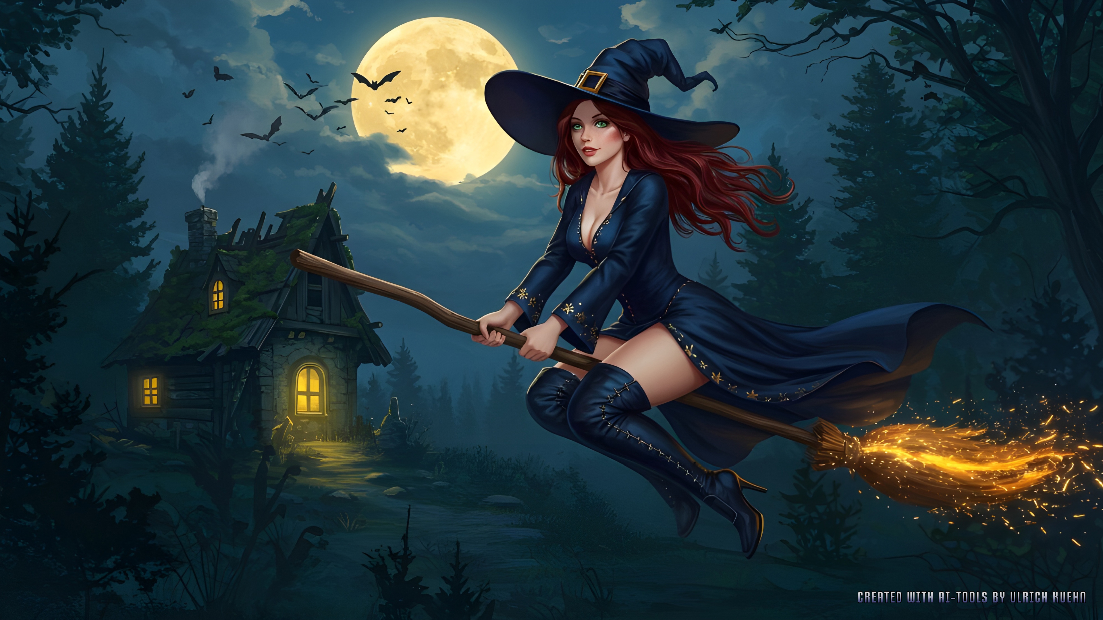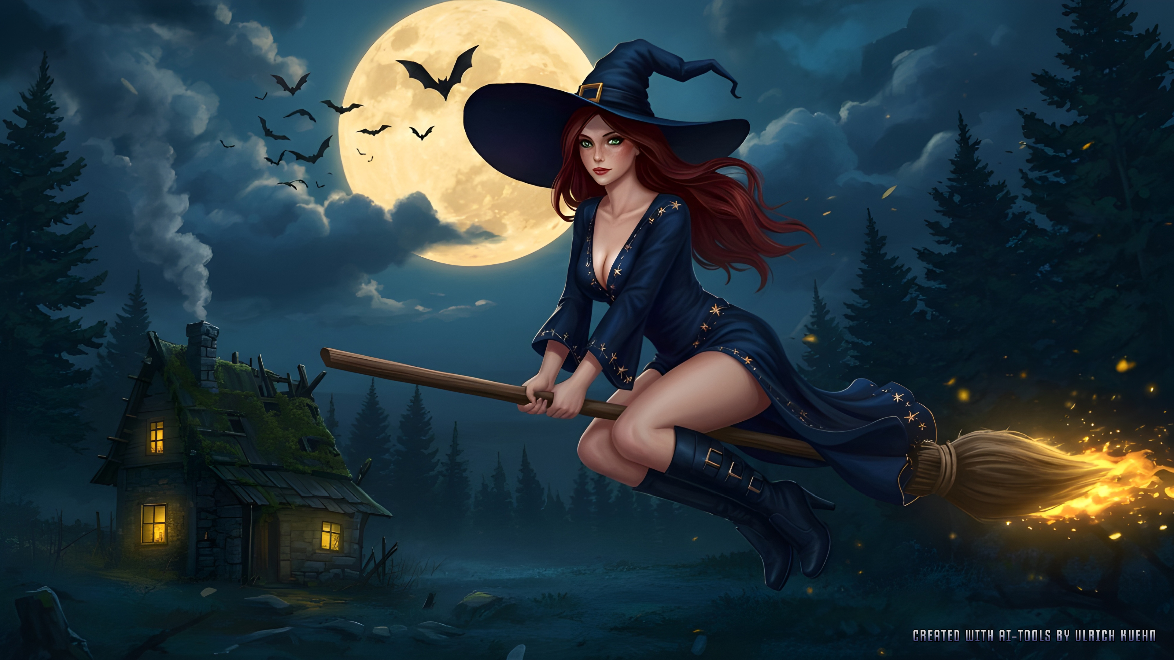 Ich habe mir gedacht, ich setze die Gute auch mal auf ihren "Feuerblitz-7000-Rennbesen". In verschiedenen Varianten. Beim Outfit musste ich die Strümpfe cutten, da mir sonst die KI keine so hohen Stiefel berechnen wollte. Das Kleid sah ebenfalls weniger gut damit aus. (Und im 17. Jahrhundert gab es garantiert keine Netzstrümpfe!) Mit Stilettos, wegen der künstlerischen Freiheit Sch...ss auf Realität bei einer Fantasy-Szene.