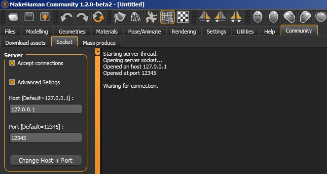 4. Über den MH-Reiter "Community - Socket" stellt ihr eine interne Verbindung (Intranet) zum MH-Blender-PlugIn her und importiert die Figur mit einem Click via PlugIn in Blender.