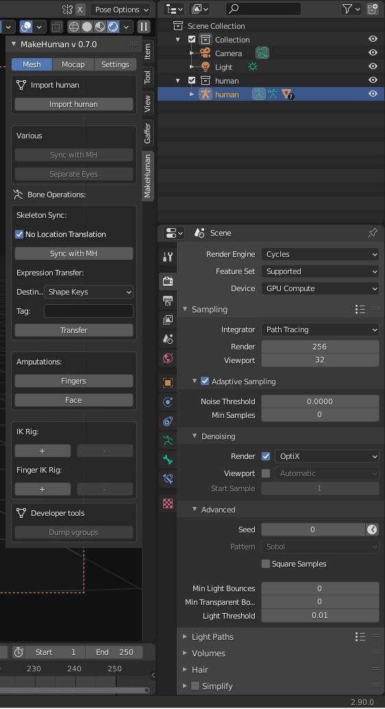 3. Startet MH und Blender 2.9 parallel und entwerft eine Figur in MH mit einem Standard-Skelett, Kleidung, Skins, Augen und Zähnen. (Haare lassen sich in