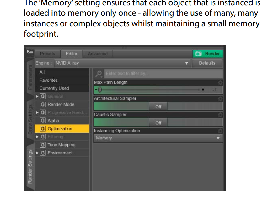 Code** IMPORTANT ** UltraScenery scenes can cause Studio to crashif the “NVIDIA Iray” preview type is used in the viewport. Select adifferent preview render option to avoid this possibility.CodeThe Iray render engine has an optimization option that it is veryimportant to be aware of. It is called ‘Instancing Optimization’and can be set to one of two settings: ‘Speed’ or ‘Memory’. Whenrendering a large number of instances ensure that this option isset to ‘Memory’.The ‘Speed’ setting instructs the renderer to load every instanceas full geometry into memory at render time. This can potentiallyspeed up a render containing only a few instances but if theinstances are of complex objects or there are many thousandsof instances then it is easy to overwhelm the system and cause acrash.The ‘Memory’ setting ensures that each object that is instanced isloaded into memory only once - allowing the use of many, manyinstances or complex objects whilst maintaining a small memoryfootprint. -