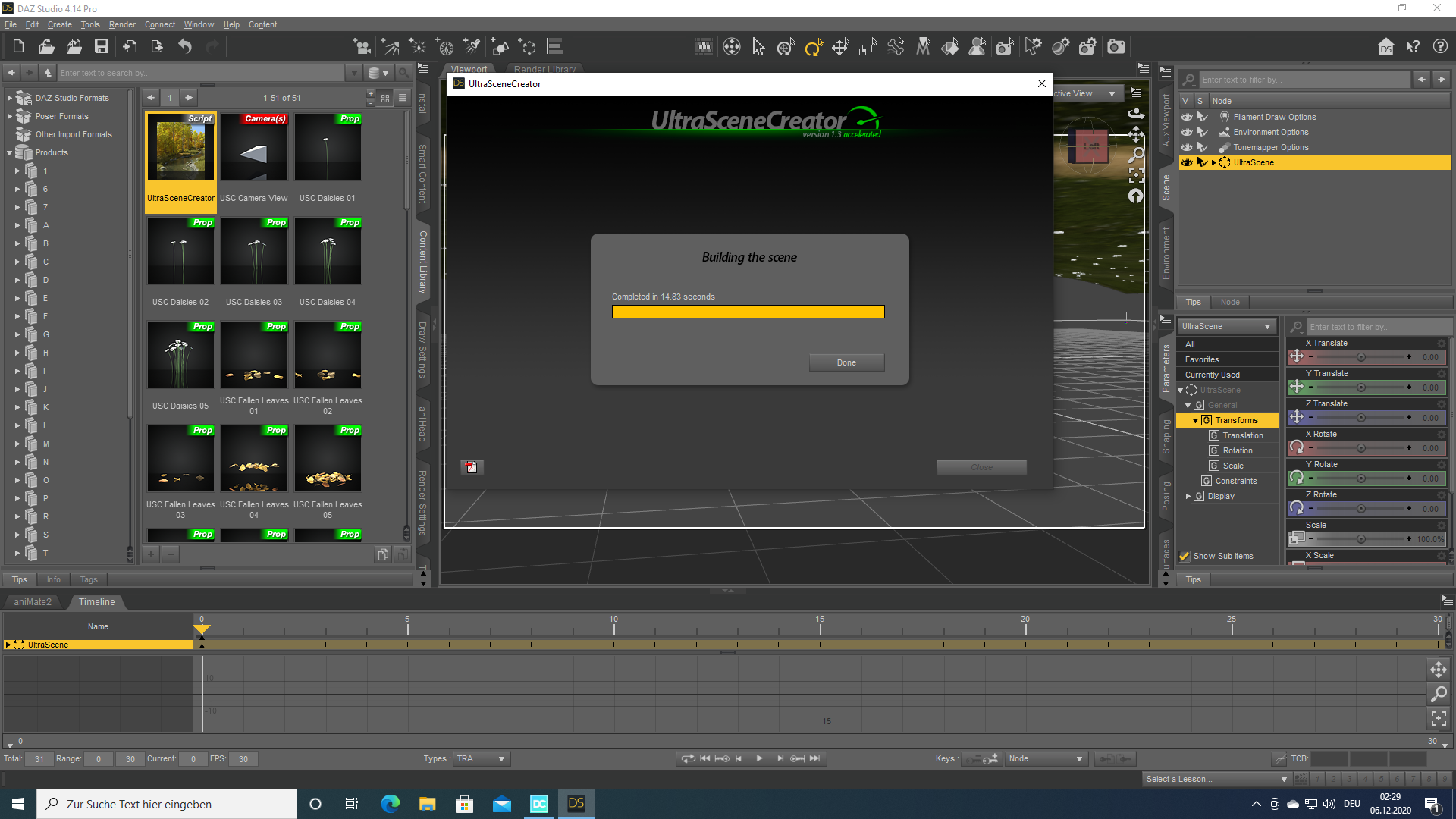 Bei mir hat er eine erste Testscene in knapp 12 Sekunden erstellt.