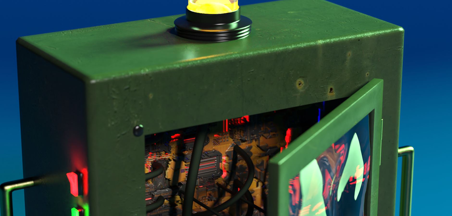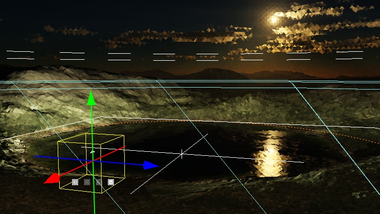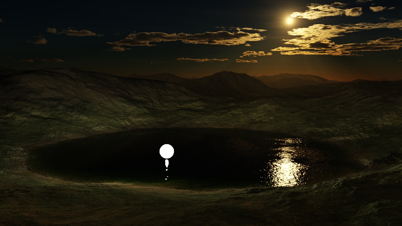 Etwas dichter über der Oberfläche werden Spiegelungen erzeugt, auch mit ausgeblendeten Objekt, doch das Umland erhält wieder etwas mehr nächtliche Schatten, wie im dritten Bild. Luminosity von den Shadern habe ich hierbei wieder auf 0 gesetzt, mir sahen die etwas glitschig aus, doch richtig gefallen mir die Farben noch nicht, werde ich noch weiter anpassen.