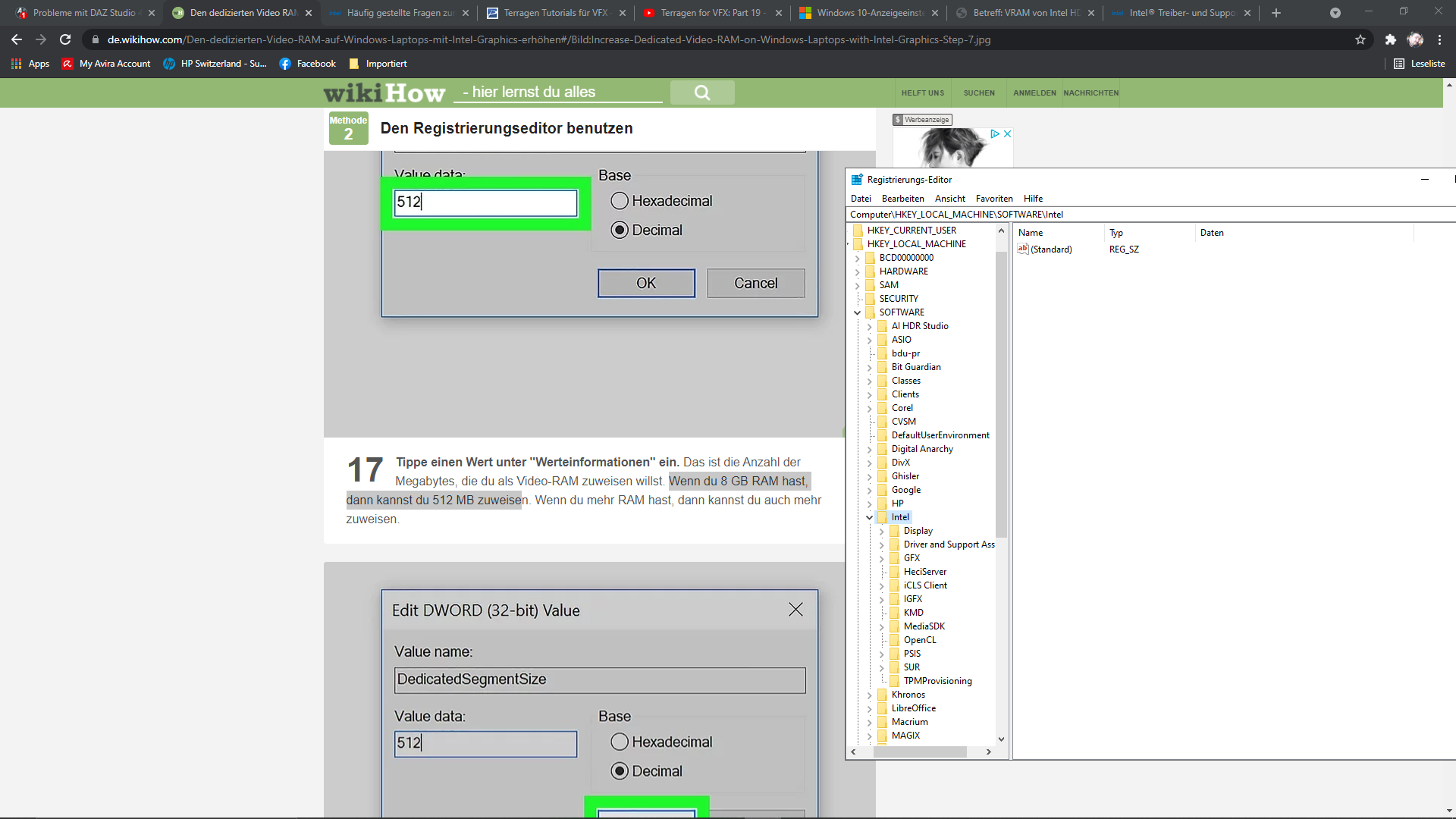 Habe den Registry Eintrag gemacht, jedoch wird bei diesem Wert als Beispiel 512MB vorgeschlagen bei 8GB Hauptspeicher. Ich habe 8GB. Kann ich nicht mehr eintragen? Meine Intel GraKa kann max. 1792MB VRAM verwalten. Muss ich nun beim Schlüssel "DedicatedSegmentSize" den Dezimalwert auf 1792 setzen? Ich will nicht riskieren dass die Kiste nicht mehr startet. Registry Hacks sind mit Vorsicht zu geniessen.