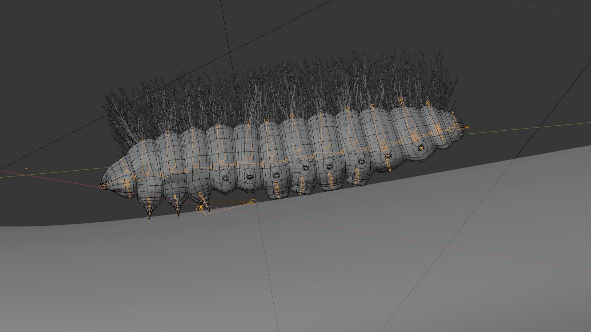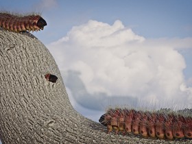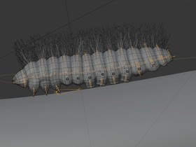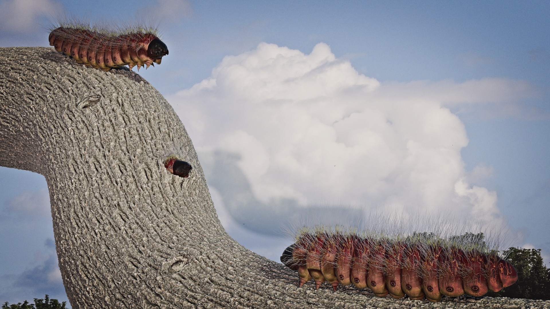 Als Vorlage diente mir eine Raupe des Weidenbohrers. Dieses Tier lebt bis zu 4 Jahre als Raupe und kann schon mal 8-10 cm lang werden. Treten sie in Massen auf können sie ganze Obstbäume lahmlegen, da sie das Holz ziemlich durchbohren. Die Texture des Baumes ist von sharetextures.com . Das Material der Raupe rein procedural aufgebaut und der Hintergrund ein Foto von mir.