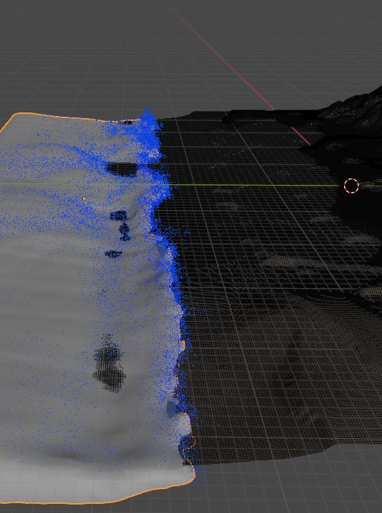 Ich möchte gerne einen kleinen Strandabschnitt erstellen und brauche dazu... Strand (habe ich) und Wasser. Wasser habe ich mit dem Mantaflow-Fluidsimulator hinbekommen und das kann ich auch exportieren. Was ich aber dazu benötige, sind die Wassertrofpfen und der Schaum, die bei der Simulation mit erzeugt werden können. Im Screenshot ist das in blau dargestellt... Das Wasser selbst kann ich exportieren - der Schaum scheint über das Pertikelsystem generiert zu werden.