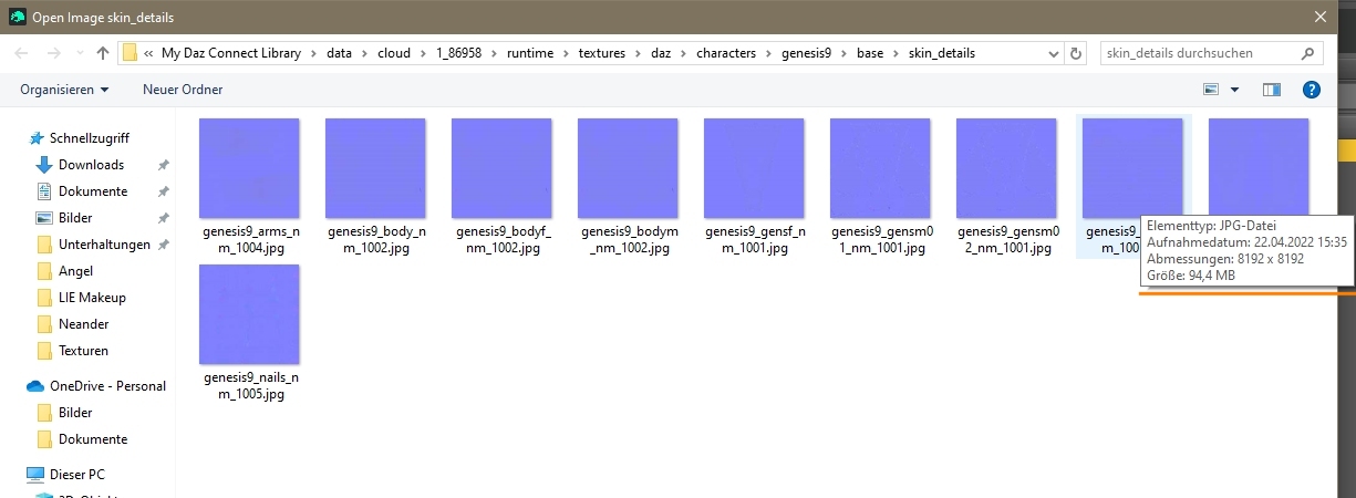 Dann hat DS mehr als eine Normal Map, aber nicht bei allen. Immer dabei, jedenfalls bei den bisher verwendeten, ist eine Detail Normal Map, bei der dann die Hautbeschaffenheit eingestellt werden kann. Also die möchte ich auf keinen Fall verändern. Jedenfalls da fehlen mir noch Versuche. Und nun zum Engel, erstellt mit Face Transfer, da geizt DS nicht mit der Größe und liefert eine Normal Map JPG von 8192 mit 94 MB mit. Nur zum Test unter einer anderen Adresse gespeichert und kam auf 110 MB. Der Unterschied scheint hier von der Größe kaum noch relevant zu sein. Vielleicht mache ich mir einfach zu viele Gedanken um die Größe der Texturen in MB, denn dagegen erscheint mir eine Zunahme von 2 auf 6 MB vernachlässigbar klein, solange es nur zwei bis drei Texturen betrifft.