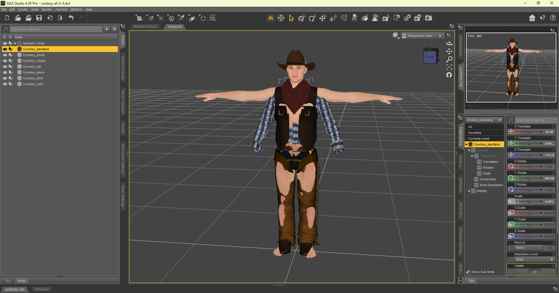 Kürzlich ließ ich mich zum Kauf eines 3d Models verleiten. Es ging mir um das Cowboy-Outfit, das ich in DAZ Studio für die die Figur Genesis 3 (male) nutzen wollte (siehe https://3dmodels.org/de/3d-models/cowboy/). Auf der Produktseite war vermerkt, dass das Model mit den Kleidungsstücken im Format DSON User File (.duf) vorliege. Das traf zu, worauf ich die Einzelteile problemlos in DAS Studio öffnen konnte. Anschließend skalierte ich alles auf 0.40 % der Ursprungsgröße. Das ist nun der aktuelle Stand (siehe angefügtes Foto). Ich möchte nun die Kleider an die Figur Genesis 3 (male) anpassen, weiß aber nicht wie weiter... Kann mir bitte jemand behilflich sein? Gibt es ein Tutorial oder Video, wo der Vorgang zur Anpassung gezeigt wird? Ich wäre für jeden Input sehr dankbar ![]()