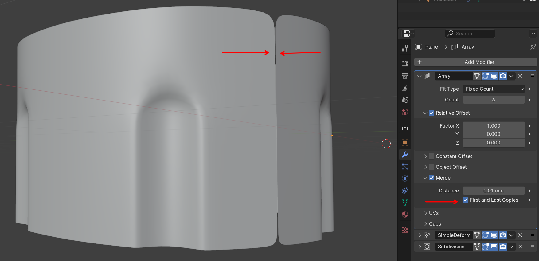 wo liegt mein Gedankenfehler, dass der Array Modifier die Lücke, wie im Bild markiert, nicht schließt?