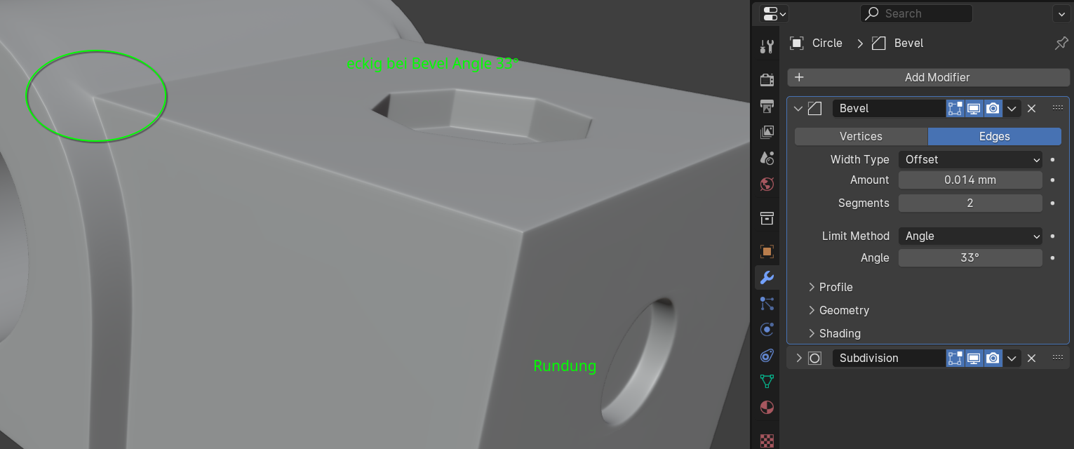 Damit kann ich beim Bevel Angle = 22° einstellen und die Kante wird nicht soweit nach hinten gezogen.