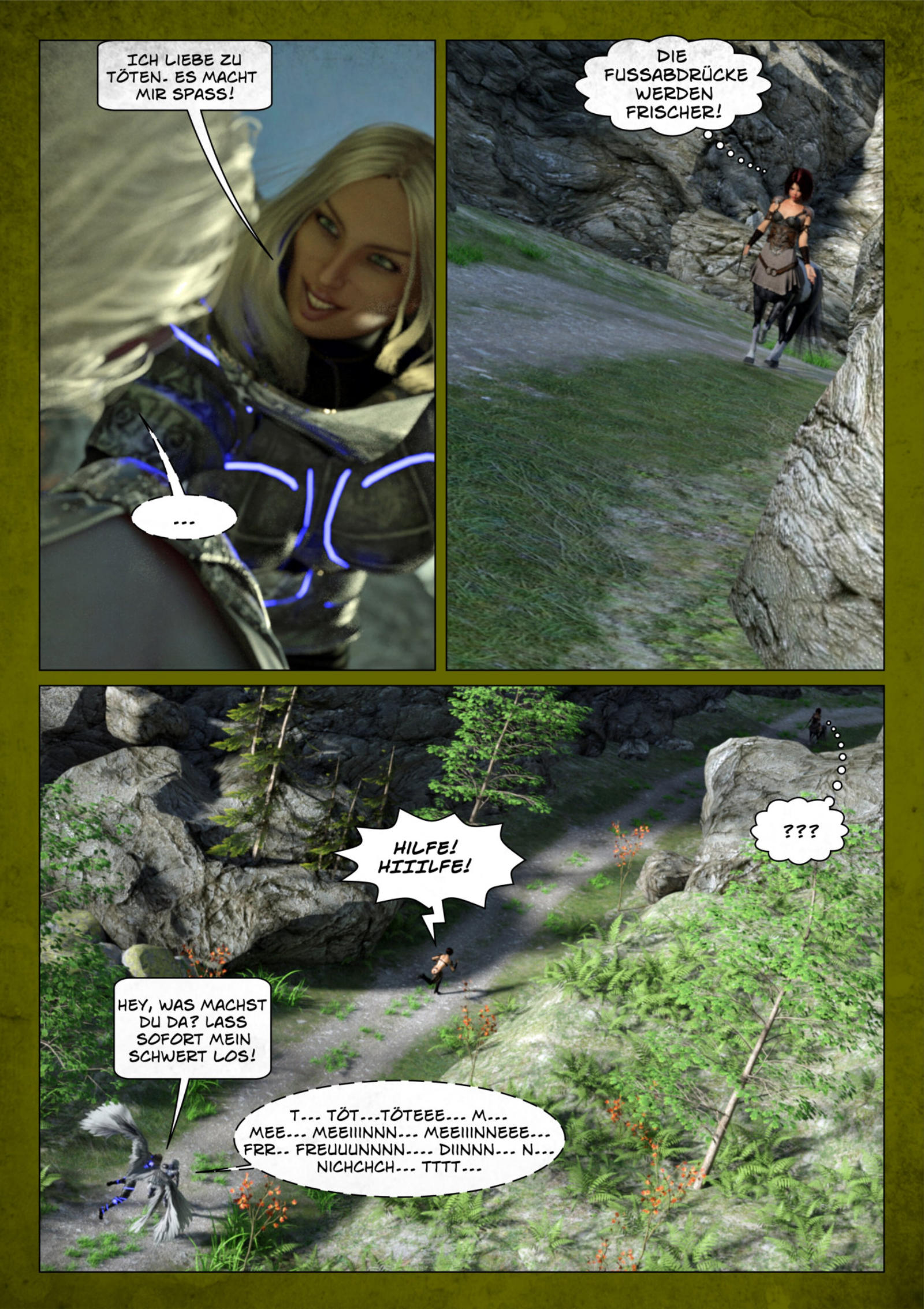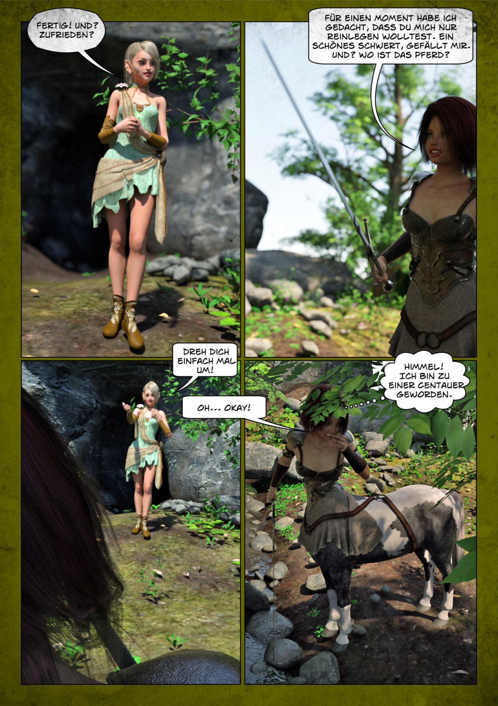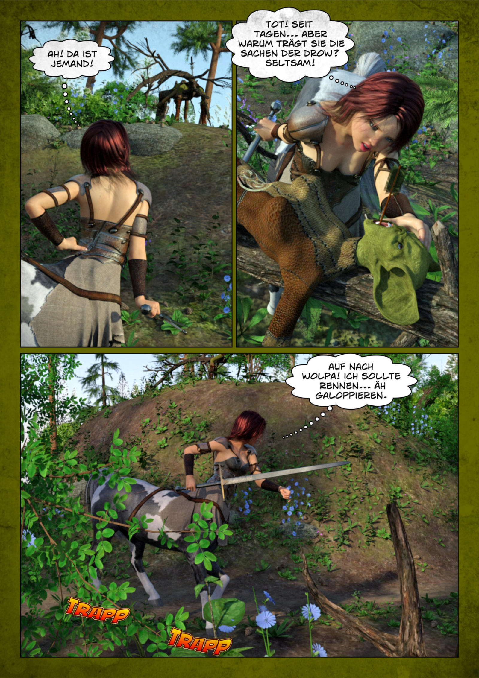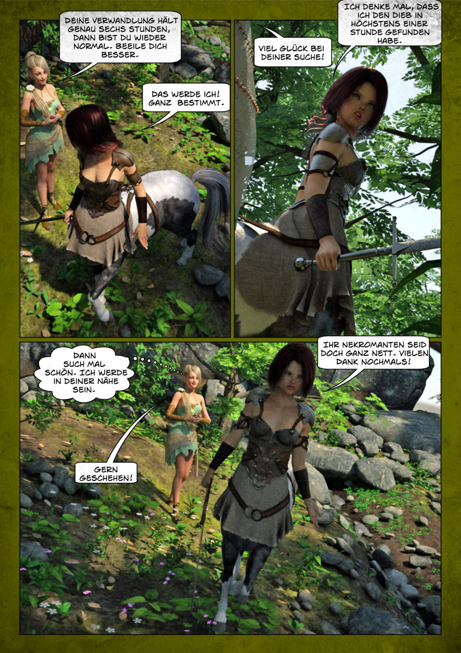 So wie sich die Hexe am Anfang in den Flugdino verwandelt hat, um Gwyn's Unvorsichtigkeit soweit zu provozieren, das sie abstürzt, verwandelt sie sich jetzt in ein Pferd, oder besser in einen Ritter zu Pferd, um Rhonda auf die Spur der Mädels zu bringen...