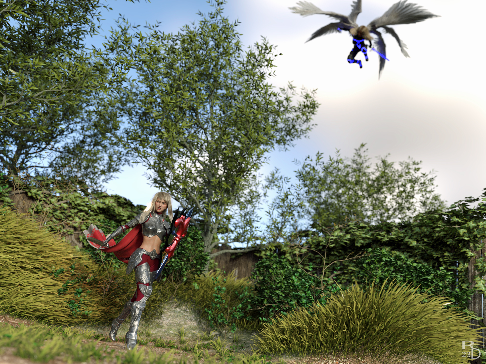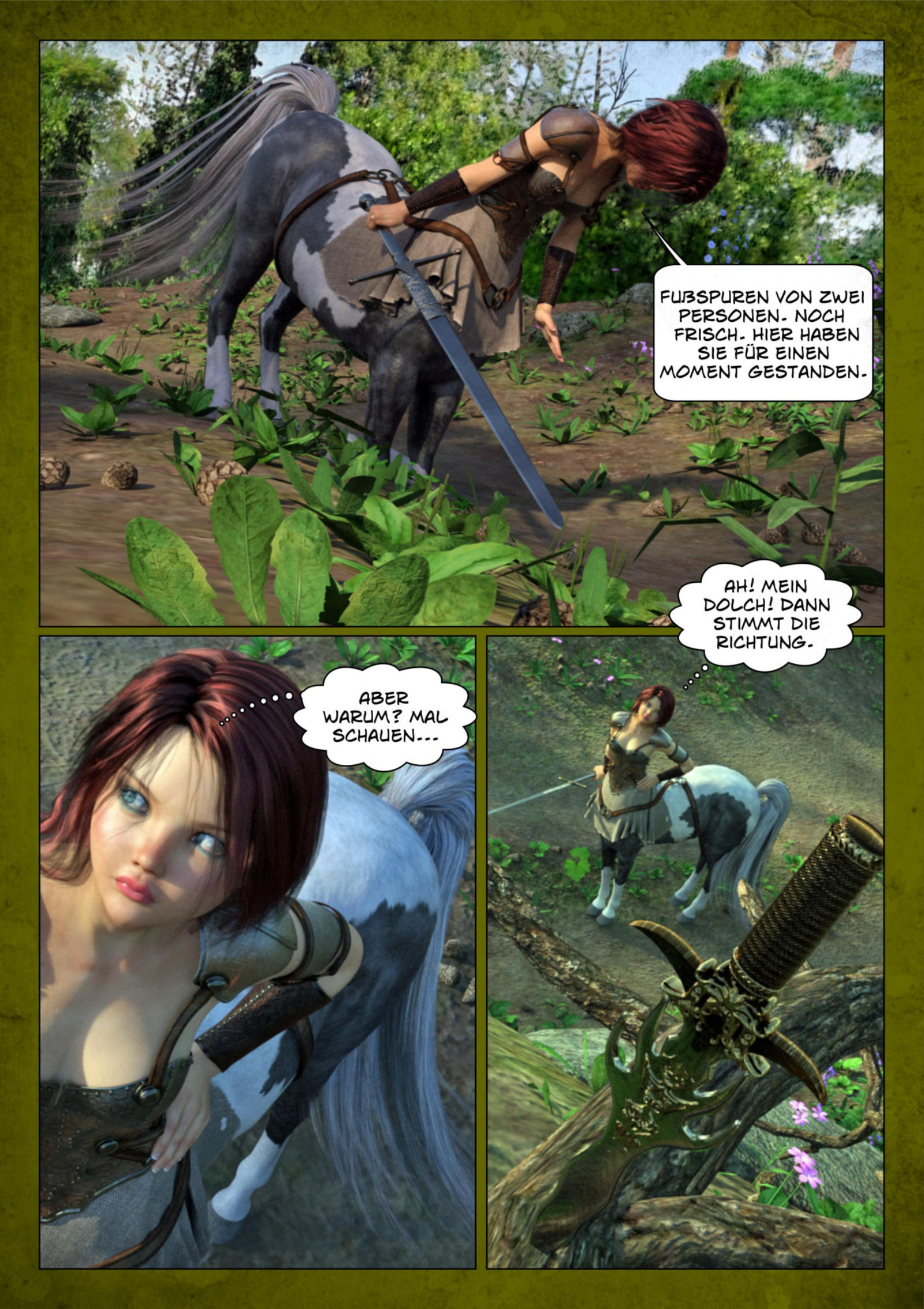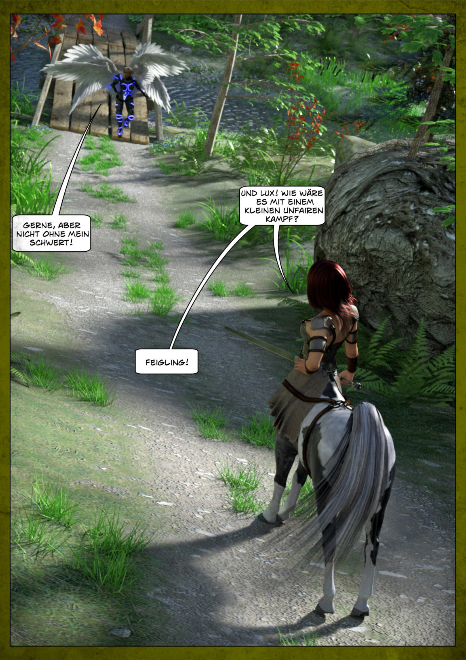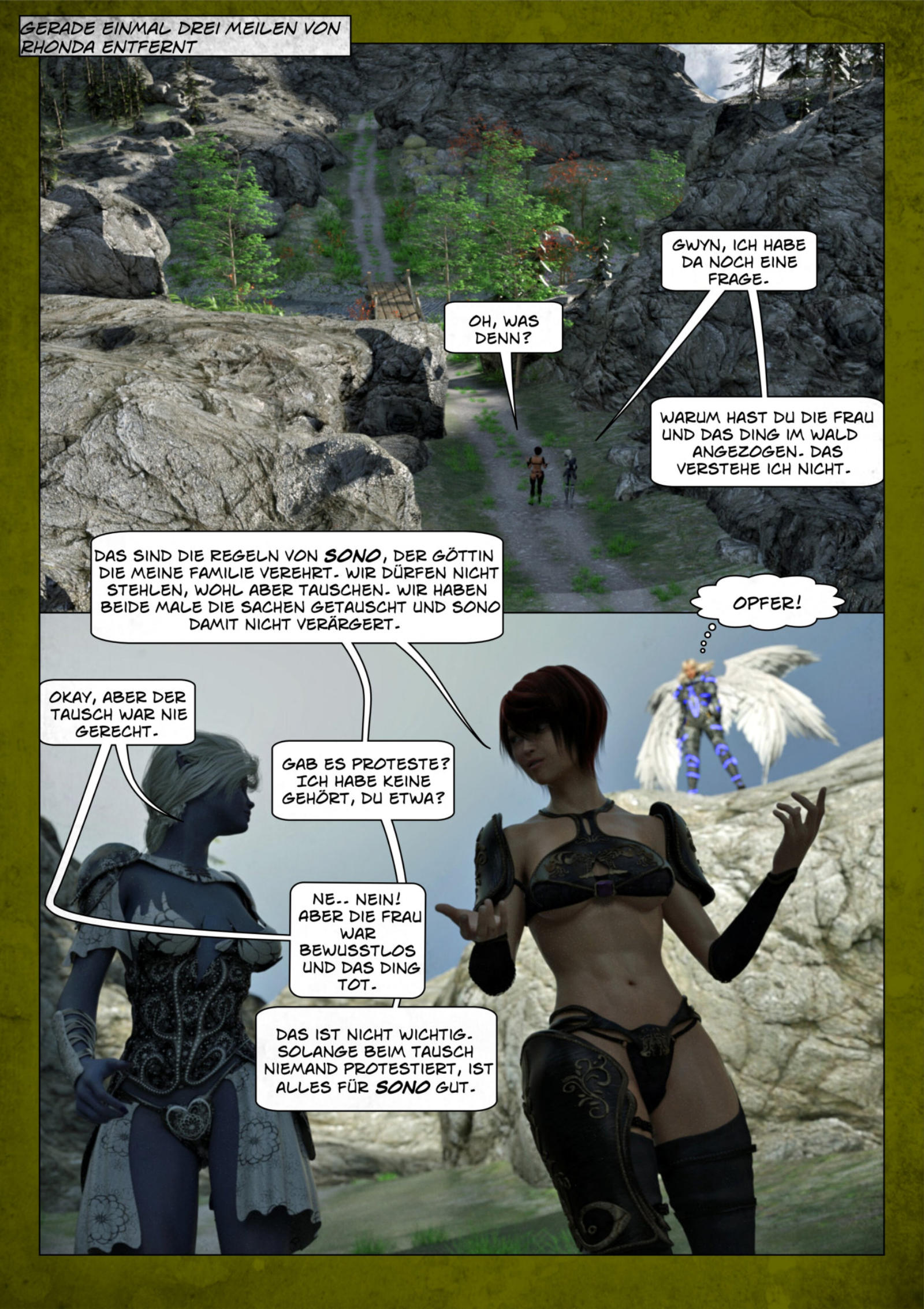 So wie sich die Hexe am Anfang in den Flugdino verwandelt hat, um Gwyn's Unvorsichtigkeit soweit zu provozieren, das sie abstürzt, verwandelt sie sich jetzt in ein Pferd, oder besser in einen Ritter zu Pferd, um Rhonda auf die Spur der Mädels zu bringen...