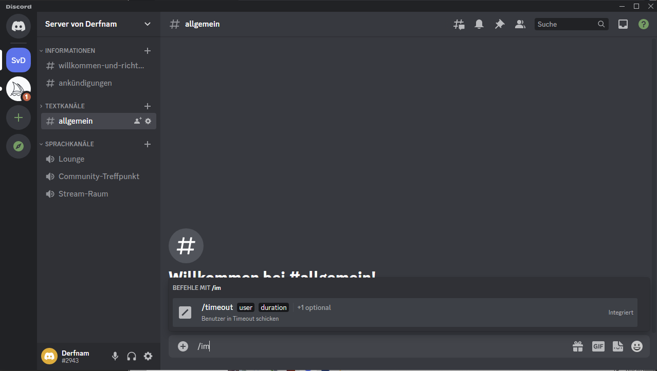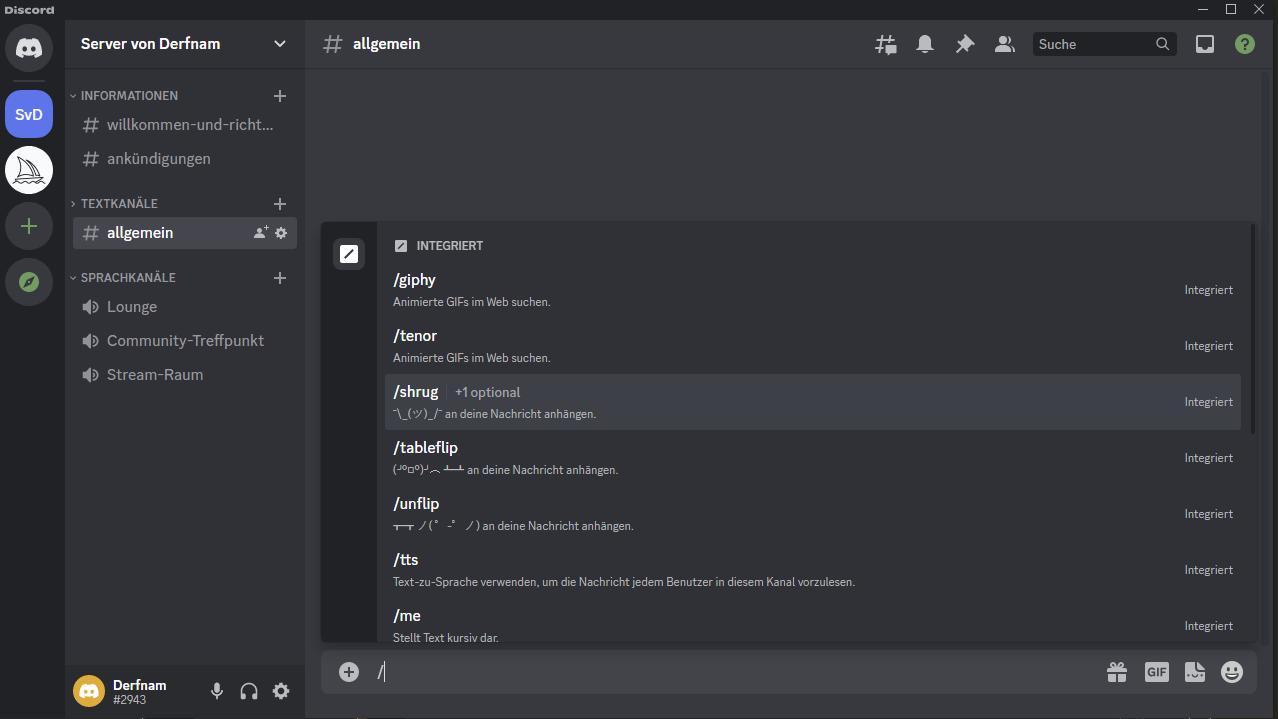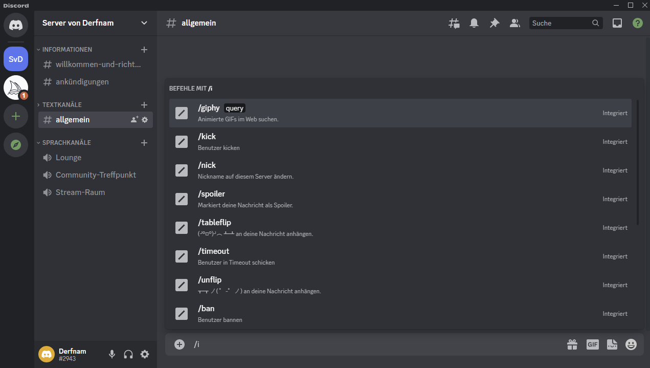 jetzt gehst du wieder in die untere Zeile, gibst einen slash ein und es erscheint eine Liste von Befehlen.