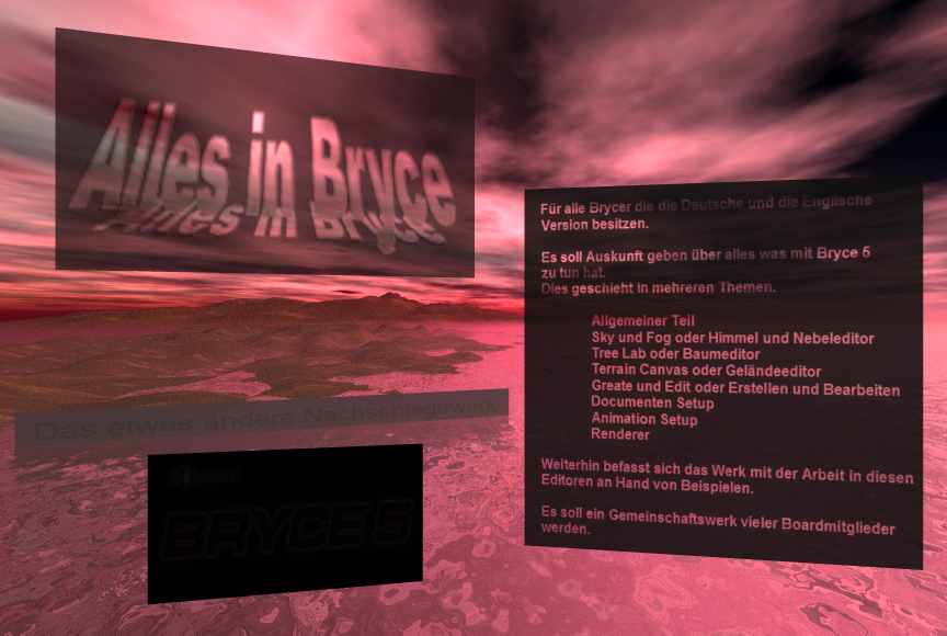 Ich plane ein Nachschlagewerk für Bryce 5 zusammenzustellen.
