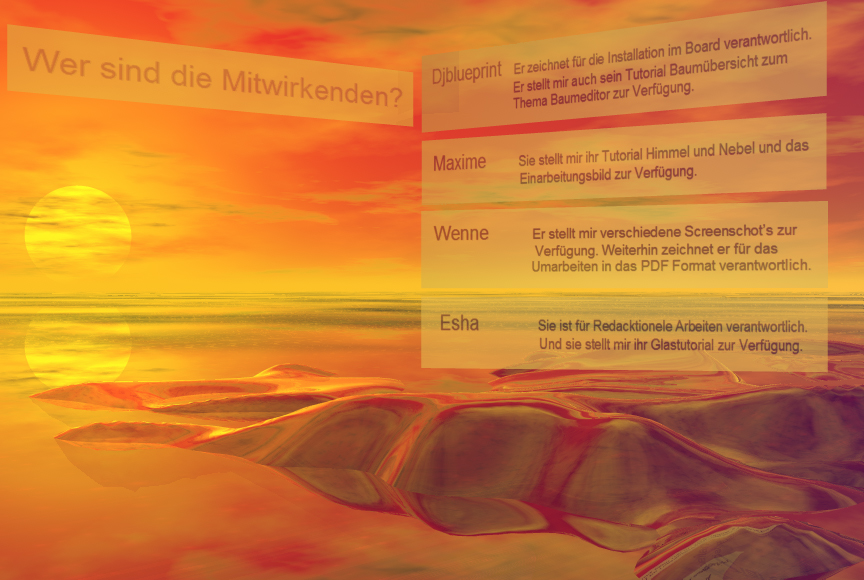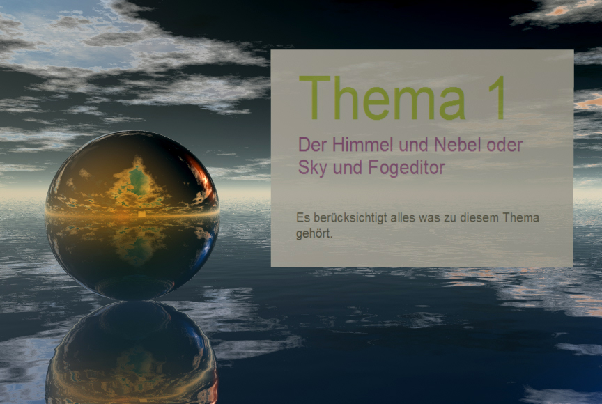 Beim ersten Themengebiet dem Himmel und Nebeleditor bin Maxime und ich noch dabei es zu bearbeiten. Da fehlen noch ein paar Teile.