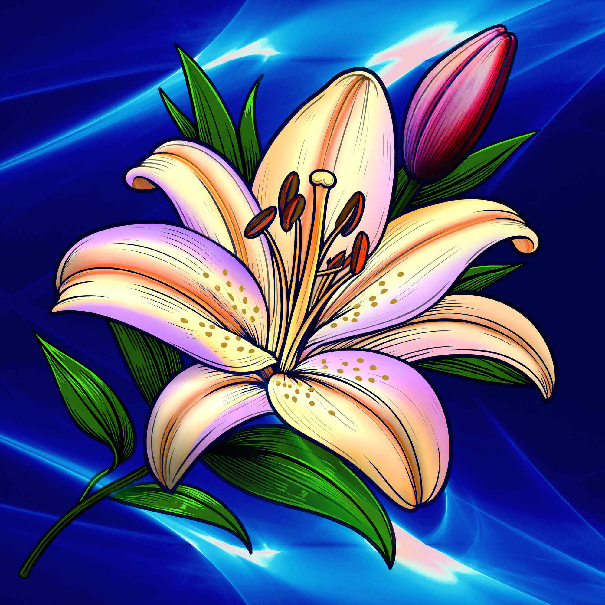 Rein zufällig fand ich im Internet Bilder zum Ausmalen, auf einer Seite gleich Tausende... Na gut, dachte ich, mache ich das eben auch mal, und wählte eine Lilienblüte. Hier das Ergebnis. Hoffe, es gefällt euch.