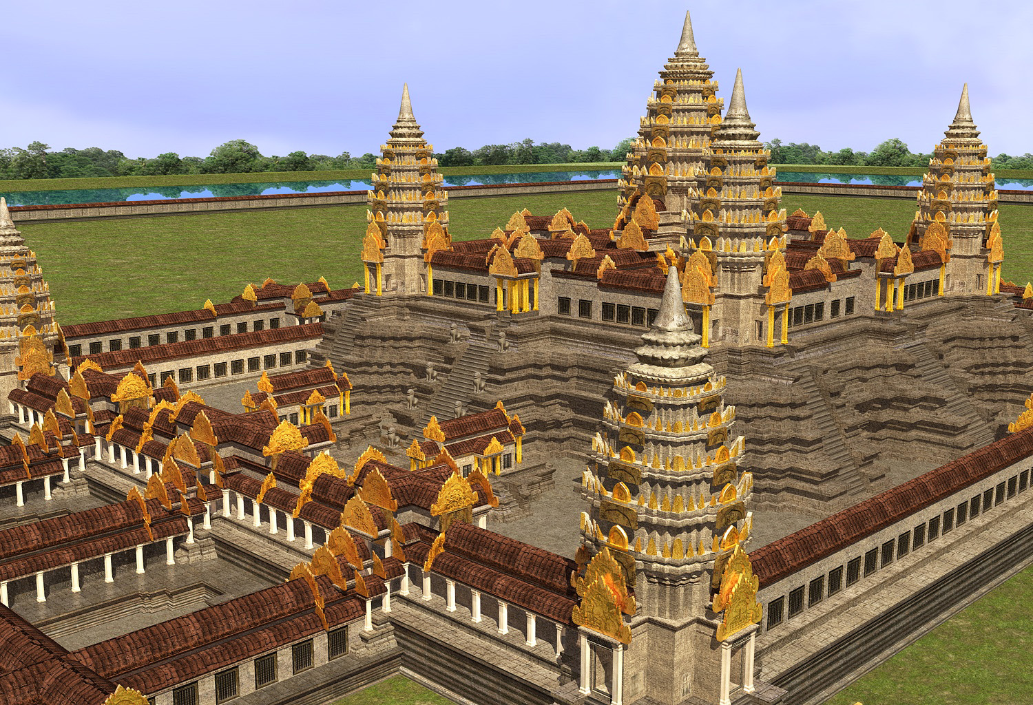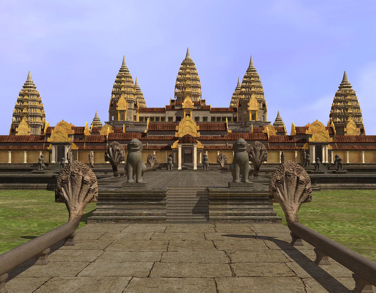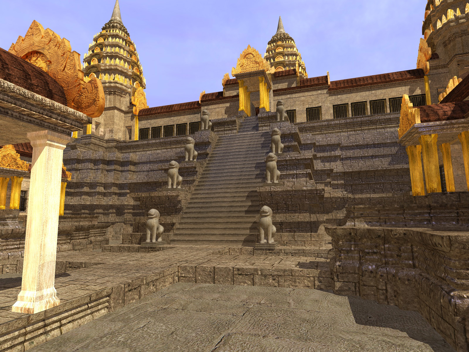 Ich habe das gesamte Angkor Wat vor 14 Jahren in C4D gebaut. Ich glaube, ich brauchte 7 Monate. Ich bekam am rechten Zeigefinger eine Gelenkentzündung. Weil ich damals nur einen schwachen Computer hatte, machte ich alles im Neuzustand, also sozusagen Angkor Wat wie es damals war, vor 900 Jahren.