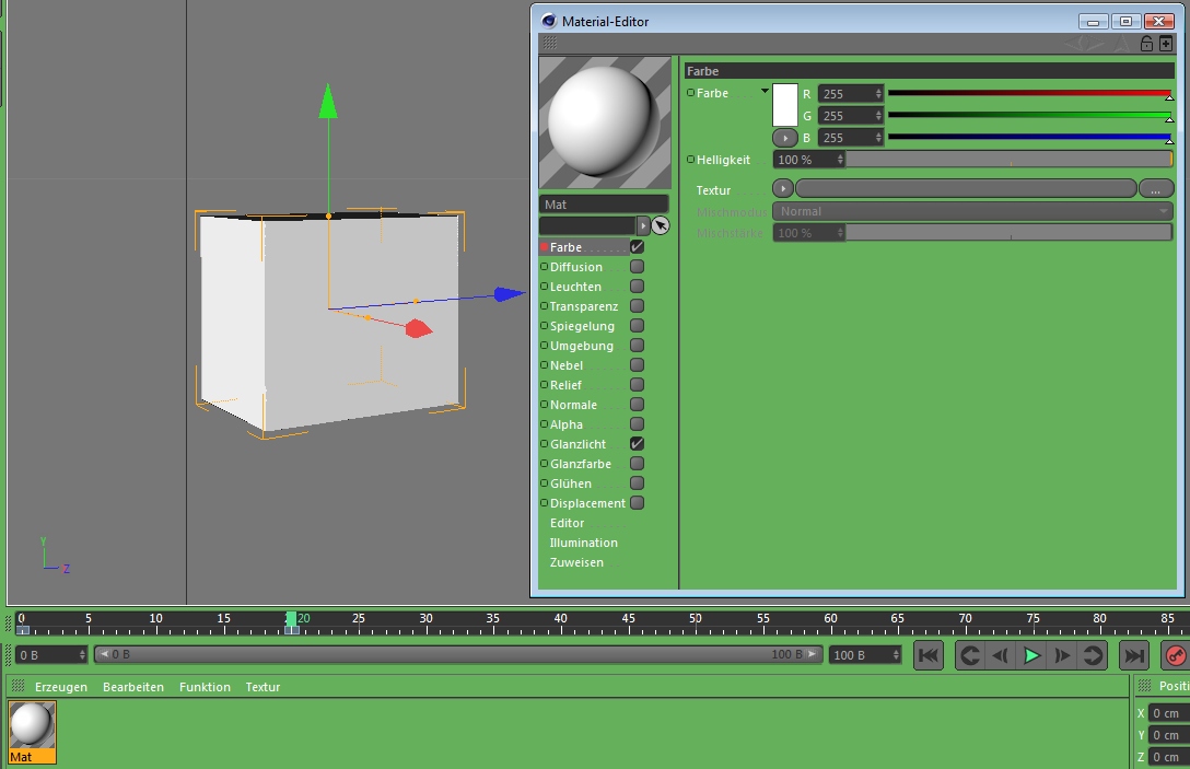 Ich wähle bei Bild 0 Blau aus und setze mit dem klitzekleinen Kreis einen Key. (Bild1) Dann gehe ich zu Bild 20, wähle Weiß aus und setze genauso einen zweiten Key. (Bild2) Doch anstatt daß jetzt die Farbe von Blau nach Weiß übergeht, löscht der zweite Key das vorherige Blau, und das Objekt ist immer nur weiß. (Bild3) Wieso ist das so? Ich konnte trotz langer Suche nirgends etwas zu diesem Problem finden. Es steht auch nirgends, daß man Farbe nicht animieren kann. Normalerweise ist eine Option, die nicht möglich ist, ausgegraut und nicht durchführbar.