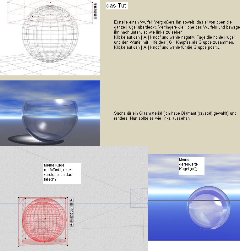ich zerbreche mir gerade den Kopf. Ich möchte eine Glasschale machen. Klappt auch alles, bis zum Zeitpunkt wo ich den Würfel über die hohle Kugel "stülpe"