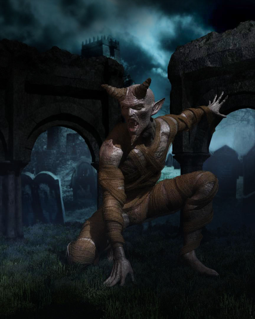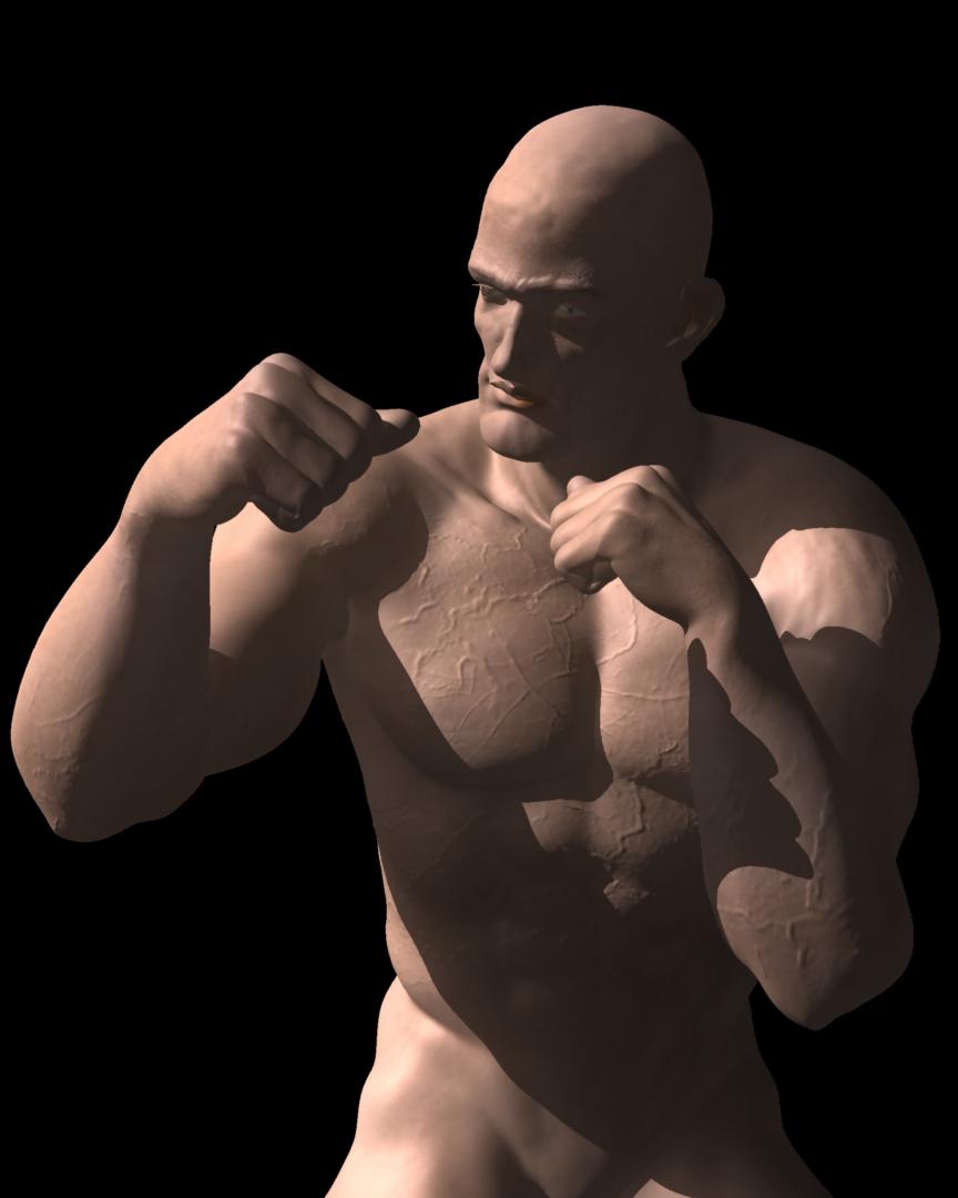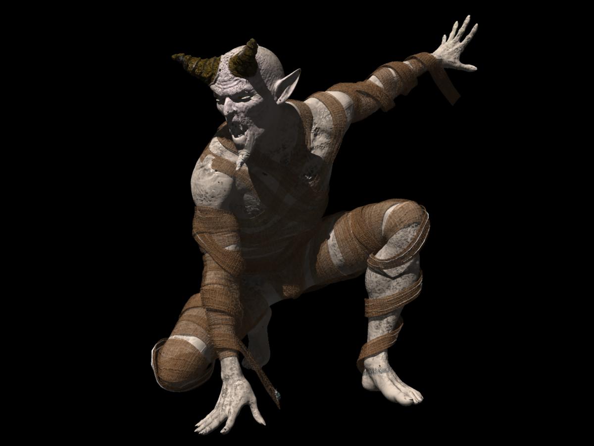 die Figur ist Genesis 8 diese angezogen (Mumie) dann in Pose gebracht und verschiedene Anpassung gemacht dann nach OBJ exortiert und in Zbrush core importiert. Dort dann de Kopf verformt und die Haut bearbeitet. dannwieder xportiert und nach Carrara gewchselt hier dann in 3D Paint den Burschn angepinselt