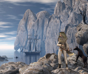 Das Dress von Aiko ist dieses Desolation Earth Nomad Dress, Kurt Hair, die Bäume und Millenium Dog LE - alles von DAZ. Das Schiff ist dieser Schooner von Jedwindells, ich glaub das gibts auch hier im Freestuffbereich, hab da nur die Segel was "zusammengefaltet"