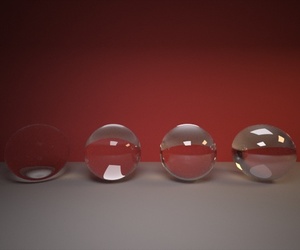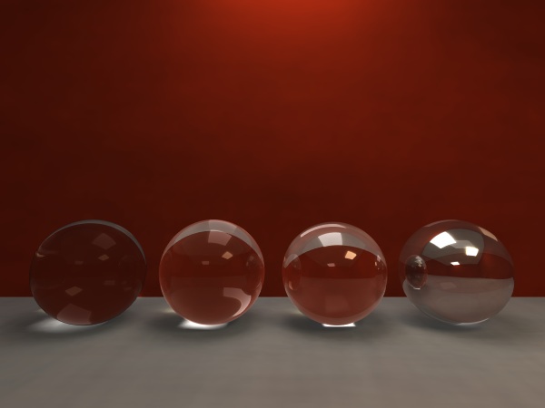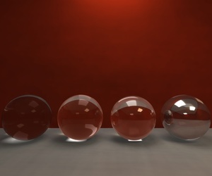 So. Heute hatte ich in Abwesenheit mal meinen Rechenknecht an Indigo gelassen und diese Szene kam nach 3 Stunden raus. Indigo speichert selbstständig in Abständen pngs ab. Ich kann immer noch im linken Teil ein Rauschen entdecken. Diese Szene, so einfach sie daher kommt, verlangt aber einem Renderer alles ab was hat, wenn er es denn hat. Der Raum ist geschlossen und mit nur drei Flächenlichtern beleuchtet, soweit ich das erkennen kann. Ich habe die Szene mal versucht in Cheetah3d nachzustellen. In meiner Szene ist jetzt gar kein Licht installiert sondern nur ein emitierendes Material auf die Lichtobjekte aufgebracht. Alles dann mit Radiosity in knapp 15min gerendert. Da ich die original Shader nicht kenne und zwischen Tansparenz, Spiegelung und Refraktion Millionen von Möglichkeiten bestehen, habe ich mich mit so einem Annäherungswert zufrieden gegeben.