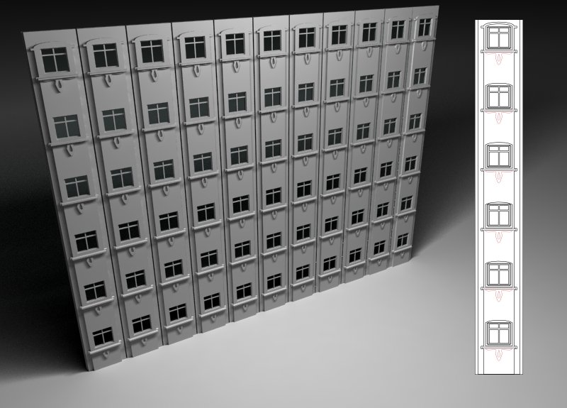Irgendwie will mir nich in den Kopp, warum das mit den Fensterrahmen jetzt so ein Problem geworden ist, wo doch alles auf Splines aufbaut. Ich hab mal son hübsch hässliches Teil innerhalb von einer Stunde ohne gestalterischen Anspruch gemacht. Ich würde bei so einem Projekt grundsätzlich die zeichnerische Arbeit, also das Erstellen der Splines/Pfade in eine externe Anwendung auslagern: Inkscape eignet sich dazu wunderbar. Allerdings fällt mir gerade auf. Selbst C4Dr10 kann weder svg noch pdf laden. Das ist jetzt irgendwie traurig.Dann ist das hier nur mehr als alternative Herangehensweise zu verstehen. Ich wollte eigentlich darauf hinaus: Wenn mir irgendwas in meinem Modell nicht passt, ändere ich einfach die Zeichnung und lade den geänderten Pfad erneut und wende alle Werkzeuge wieder auf ihn an, damit alle Klone oder Arrays wieder am gleichen Platz erscheinen. Ich könnte mir auch vorstellen eine gesamte Gebäudeseite erst zu zeichnen und dann erst zu exportieren.