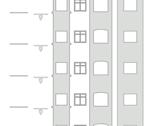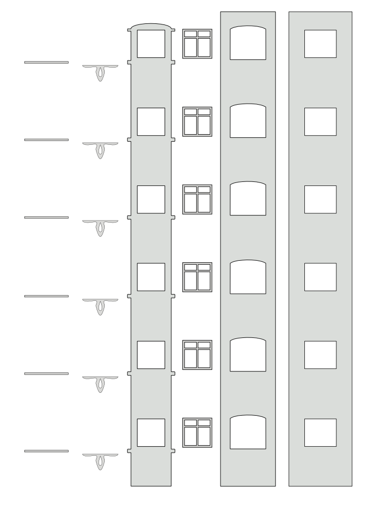 Ich habe die Flächen mal angetüncht, damit man sieht, wo sogenannte "combined paths" verwendet wurden; die mit den Löchern drin. In Wirklichkeit liegen die 6 Pfadreihen übereinander, werden als pdf oder svg in Cheetah3d geöffnet (einfach aufs Programmicon legen). Dann bekommen die einzelnen Pfade das extrudetool zu spüren. Werden dabei die Pfade horizontal verschoben kommt das verschachtelte Fassadenrelief zum Vorschein.Will ich aus diesen extrudes jetzt ne Fassadenfront stricken, werden die 6 extrudes per array aneinander gereiht. oder ich arrangiere die Seite eben komplett in Inkscape und verzichte aufs Array, oder fasse sie zu einem Objekt zusammen