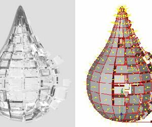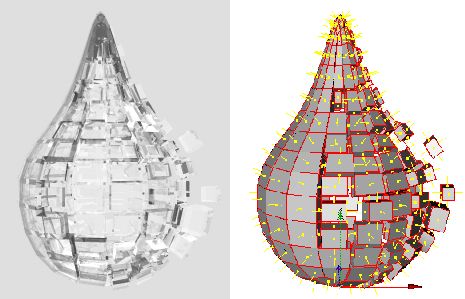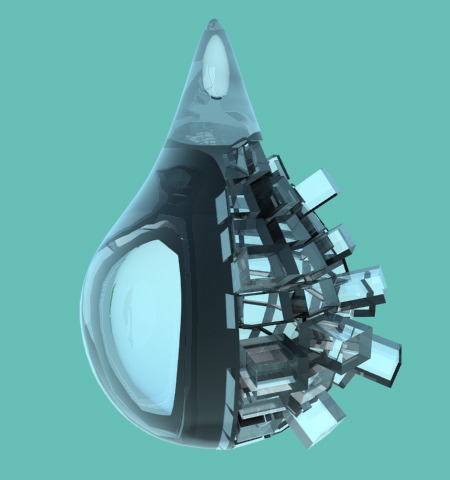 Gibt viele Wege das zu machen. Mit einem Spline anzufangen und die halbe Tropfenkontur damit zu zeichnen um es anschließend im Lathetool zu einem Drehkörper zu modifizieren wäre eine. Ich bin aber mit ner Box gestartet. Vertikal gedehnt, und einmal horizontal unterteilt, oben die Spitze fast auf null skaliert, den Bauch dicker gemacht und einen Subdivisionsmodifier reingeschmissen. Nach dem Umwandeln den Tropfen etwa halbiert und die Spitze aber ganz gelassen. Die Polys auf der rechten "disconnected" und Gruppe aufgehoben, ausgewählt und so verkleinert, dass, wenn man jetzt die Polys auf einen Rutsch zu Würfeln extrudiert wieder die gesamte Aussenkontur aufgefüllt ist. Dann habe ich mir diesen und jenen Würfel aus der Menge rausgezupft.
