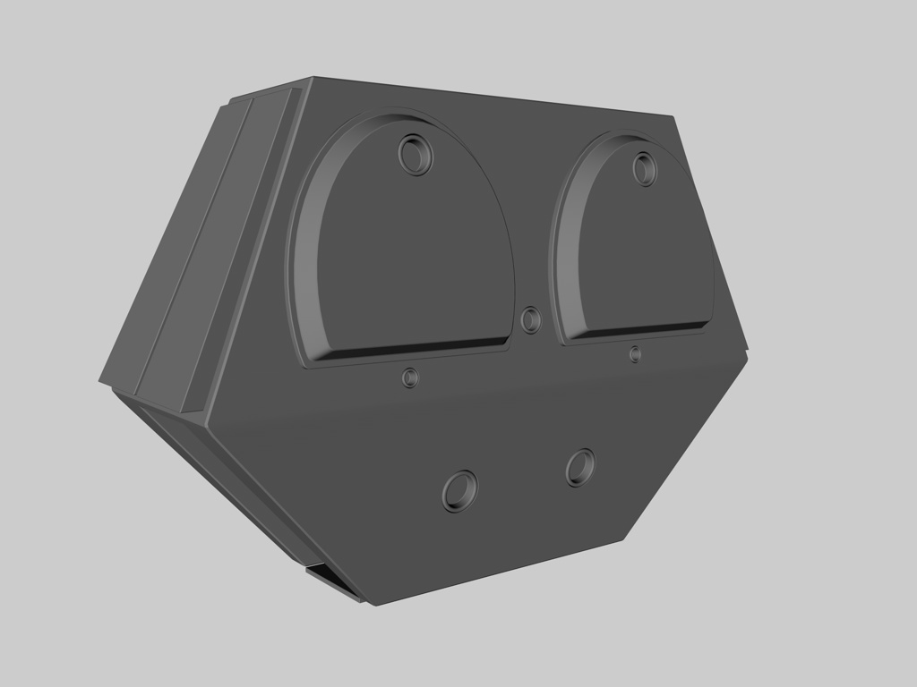 Zum größten Teil verwende ich hier keine Boole-Objekte, weil das Aufräumen des Meshes etwas nervt. Stattdessen definiere ich durch Schnitte die Bereiche, wo sich runde Aussparungen befinden sollen. Auf diese Bereiche projiziere ich Kreissplines, bevor ich die Bereiche lösche. Aufgrund der schrägen Oberflächen ist Projektion hier ideal, um die Splines paßgenau zu positionieren. Anschließend werden die Splines extrudiert, editierbar gemacht und mit dem Hauptobjekt verbunden. Dann muß nur noch mit der Brücke-Funktion bzw. "Polygonloch schließen" die Geometrie wieder komplettiert werden.