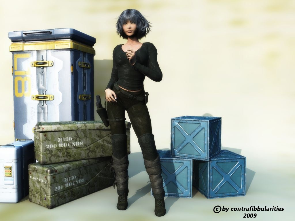 Bei dem zweiten Bild sollten eigentlich möglichst gar keine Graustufen drin sein, die Schwarz-Weiß-Bereiche sehen ein bisschen so aus wie ein bestimmter Comic-Stil, das fand ich an der Variation ganz nett. An der Variante stört mich selbst, wie schon erwähnt, eher der Schatten der Kisten, der nicht so recht zum restlichen Bild paßt. Hier müßte ich allerdings auch nochmal extra rendern und den Schattenwurf der Kisten ausschalten, um das Ergebnis zu erhalten, das ich gerne hätte. Auch das wieder eine Geduldsfrage wegen der langen Renderzeiten. ![]()