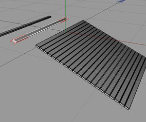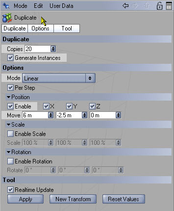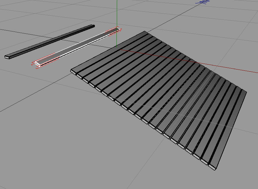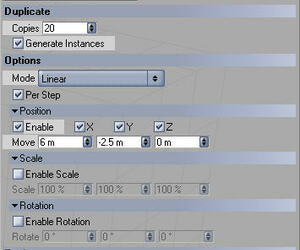 Die Modellierachse muß nun für den nächsten Schritt auf "Normalen" umgestellt werden, damit die Bretter beim Kopieren entlang der Dachneigung dupliziert werden. Das Objekt muß dann im Modus "Linear" entlang der X-Achse (jedenfalls in meinem Beispiel) dupliziert werden. Ich habe hier 20 Kopien eingestellt. Jede Brettkopie muß um 3cm entlang der X-Achse (= die Tiefe des Bretts) und um -2,5cm (= Bretthöhe) entlang der Y-Achse kopiert werden.