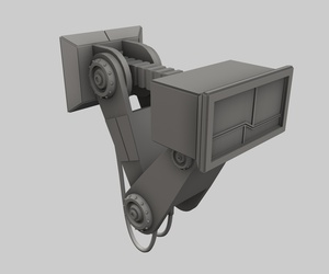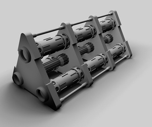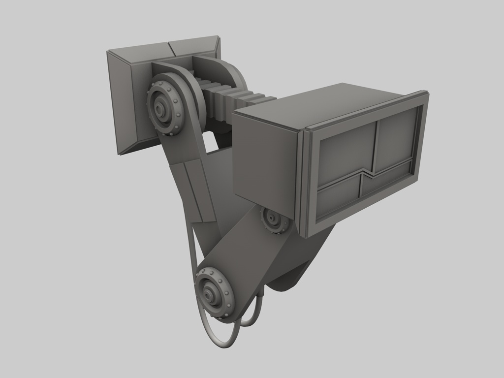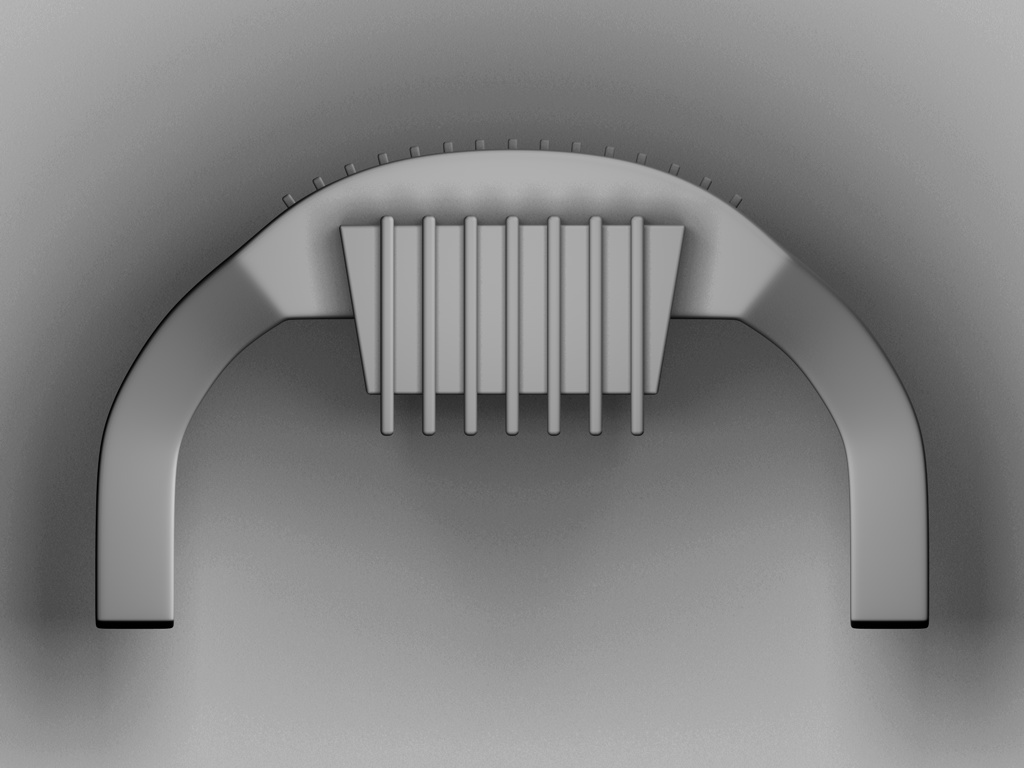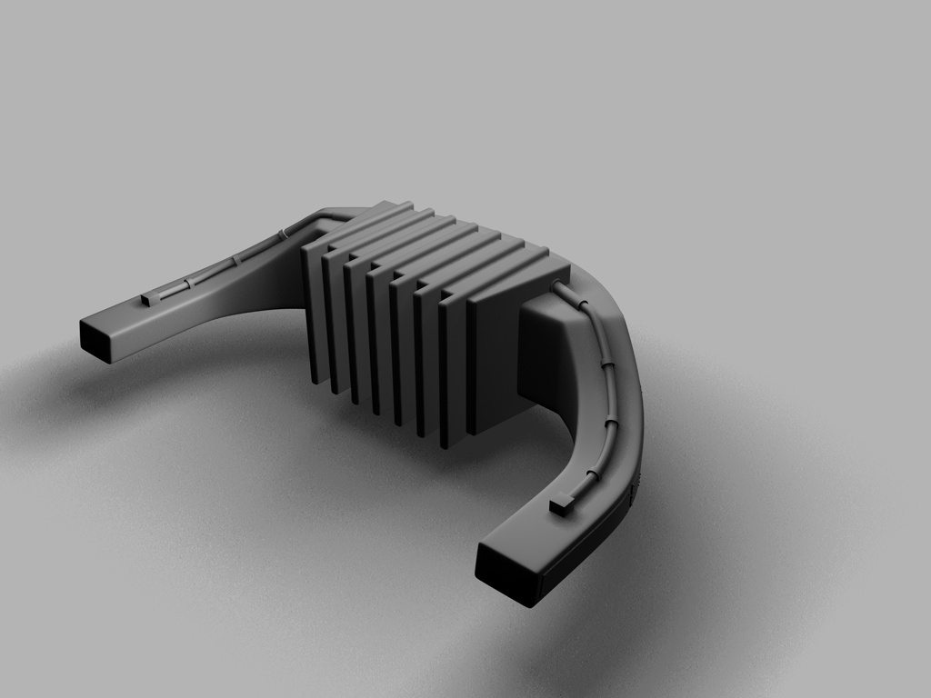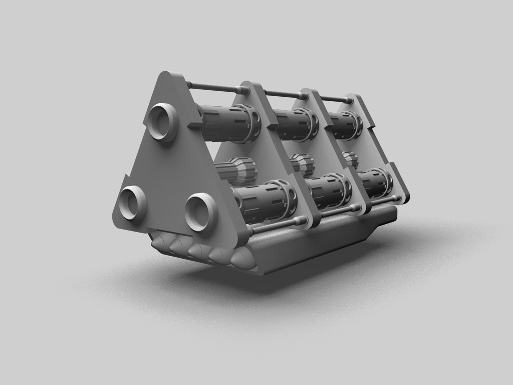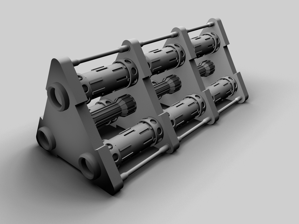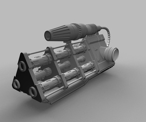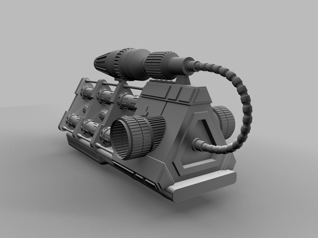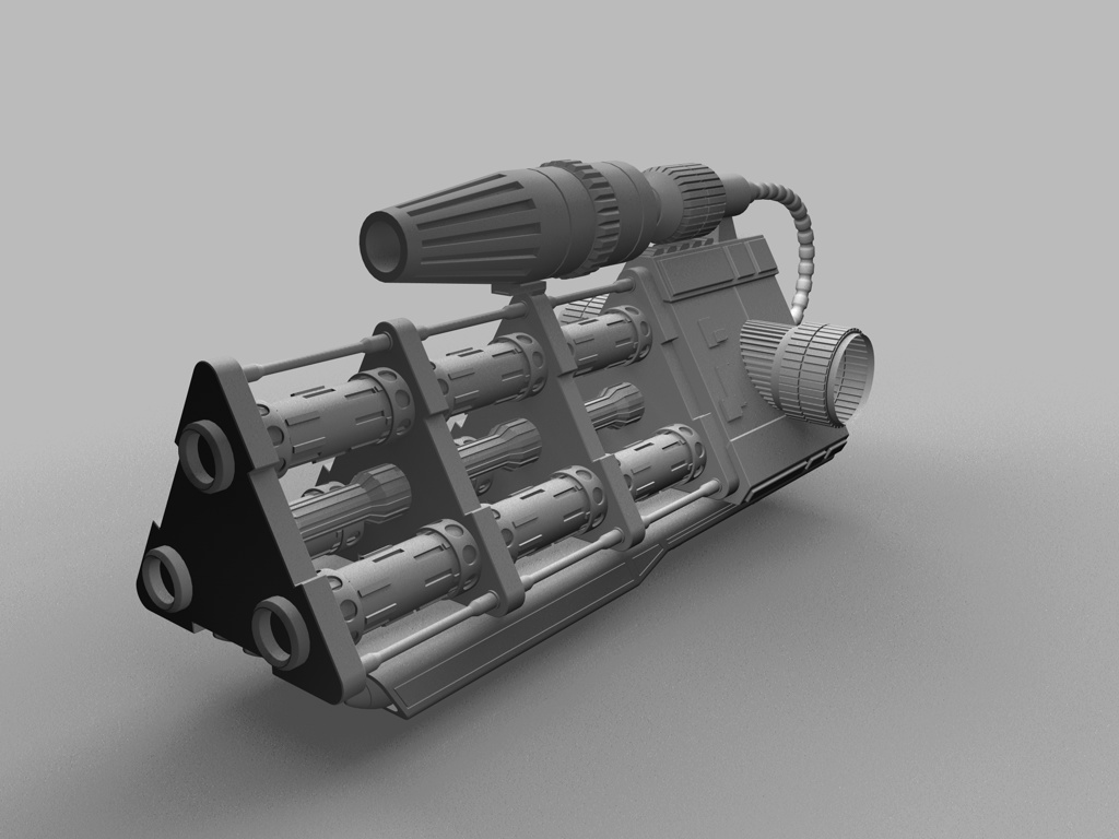 Der ... Zerstäuber ist jetzt auch fertig, inklusive "Rocket Launcher" am unteren Bereich. Ich sehe gerade, dass der Raketenwerfer in das obere Teil reinsteht, diese Überlappung muß wohl beim Extrudieren des hinteren Verbindungsstücks entstanden sein. Für den nächsten Render muß ich das Teil halt ein paar Einheiten nach unten befördern.
