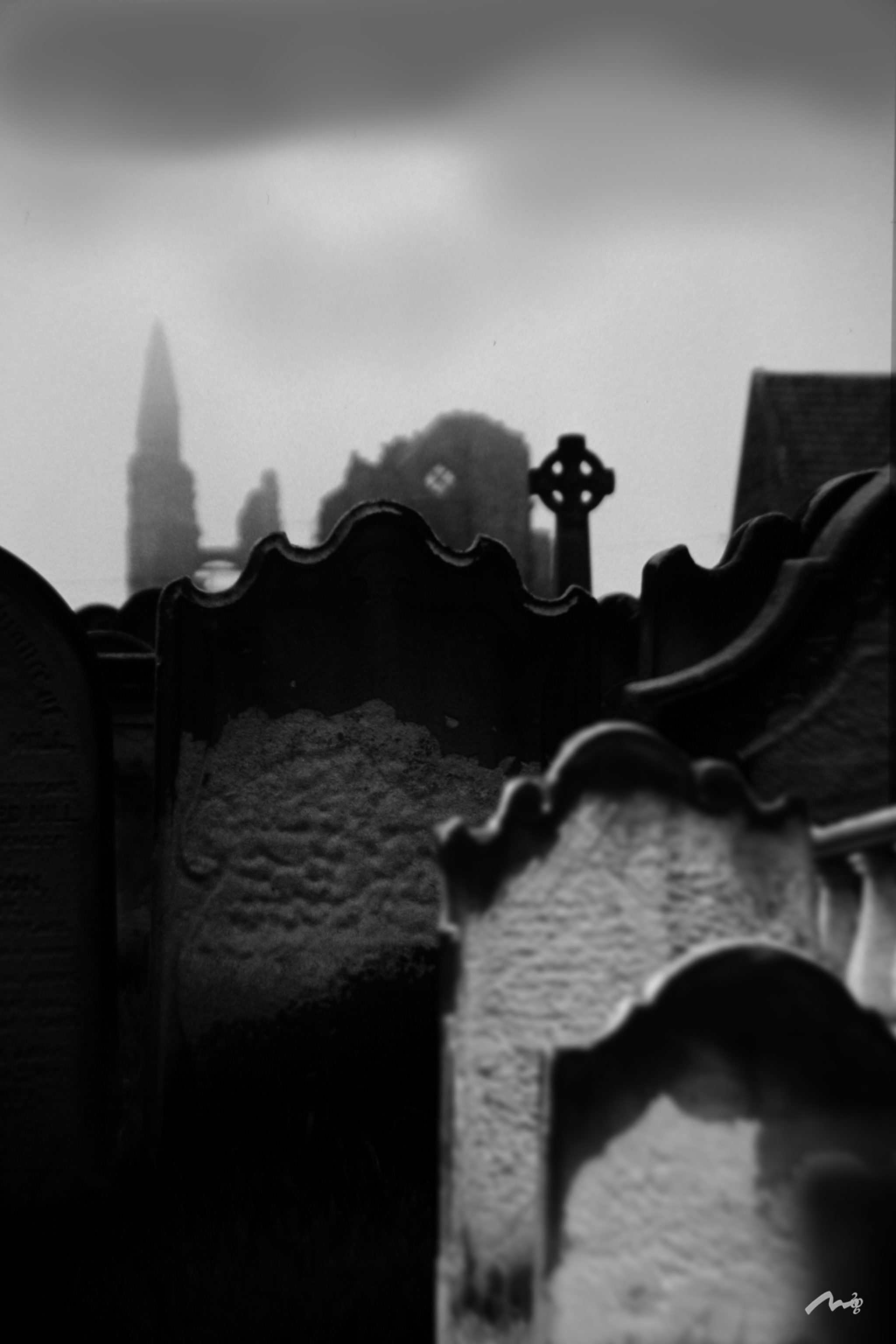 Wiederum auf eine neue Ebene habe ich die beiden Grabsteine im Vordergrund eingesetzt, die ich von einem anderen Bild (selber Friedhof) ausgeschnitten habe. Letzteres Bild habe ich jetzt grad nicht nicht gefunden, aber irgendwo muss es ja noch sein.