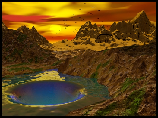 ich fühle mich zwar immer noch als Anfänger - man lernt ja nie aus - aber ich dachte ich könnte das Bild hier mal zeigen. Es ist in Bryce 5 erstellt, lediglich die Vögel wurden später in PhotoPaint dazu gemalt. Leider ist die Idee zu dem Bild nicht von mir, sondern von einem 2d-Künstler. Auf seiner Seite findet man tolle Anregungen: https://www.sahm-bilder.com