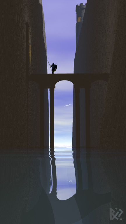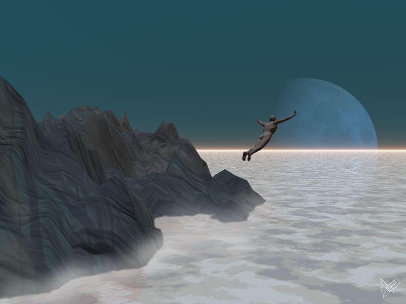 Stimmt, war eher als Traum-Bild gedacht, habe die Flächen und Texturen (Fels, Figur, Wasser/Wolken) deshalb auch flächig und vereinfacht gehalten.